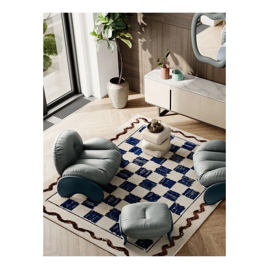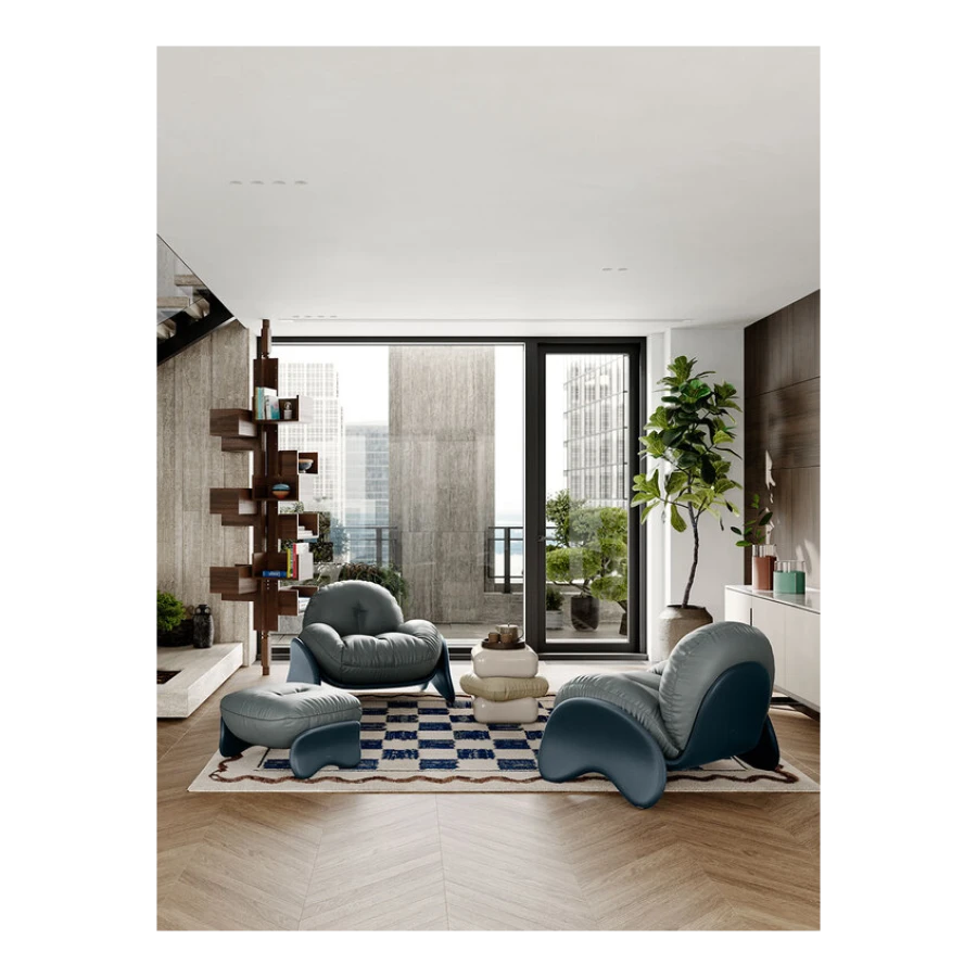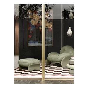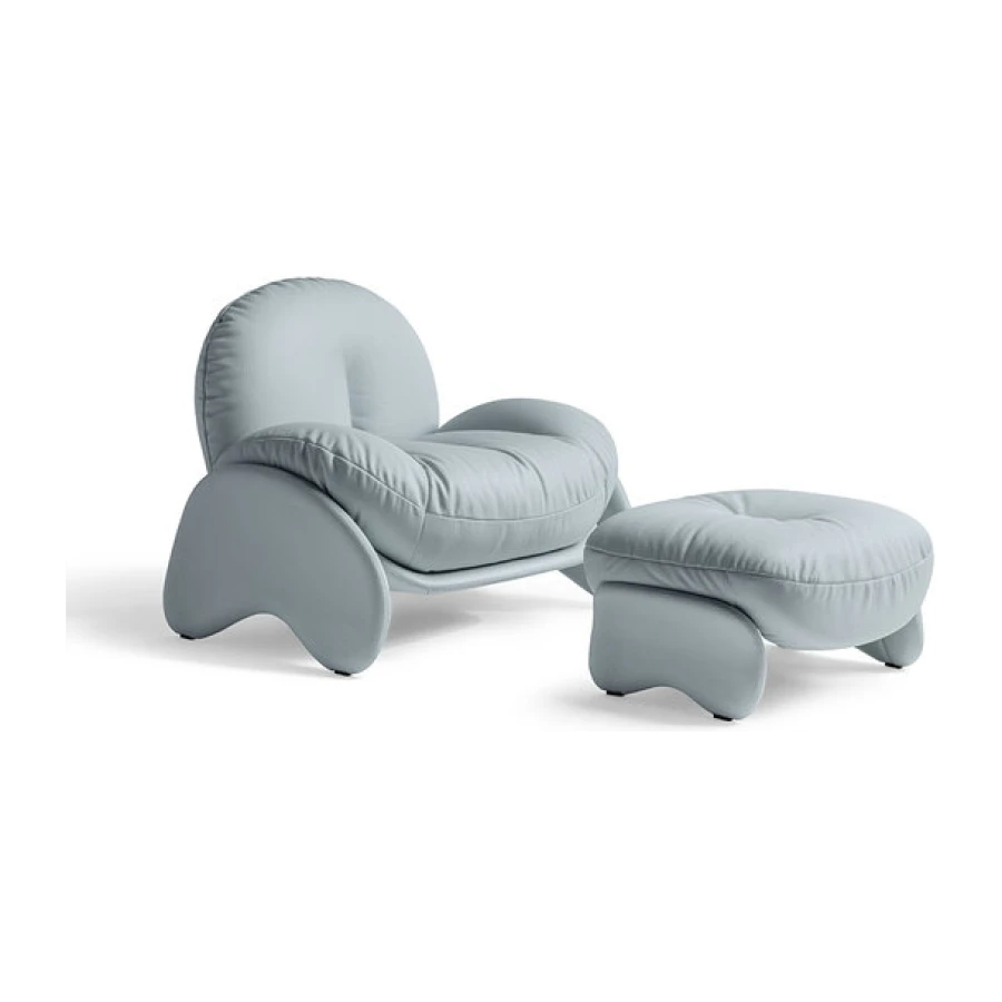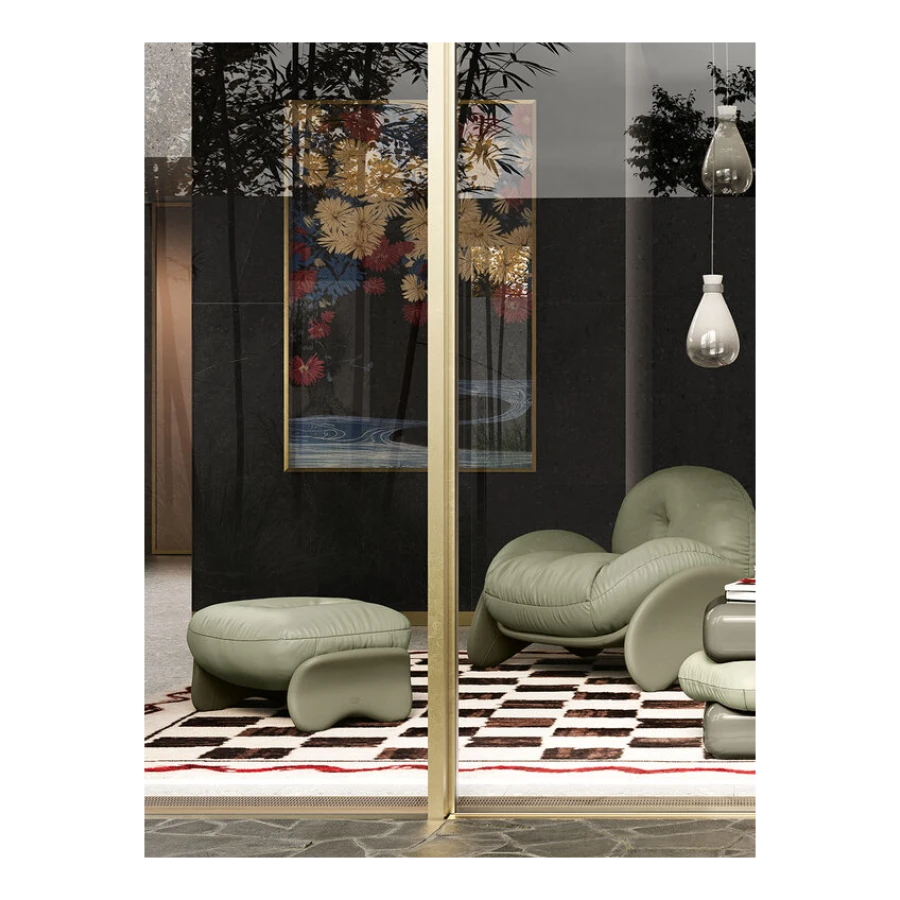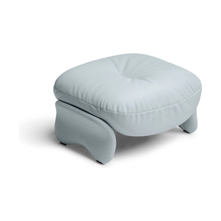 The cozy Squash ottoman, perfectly paired with the armchair in the same collection, features a birch plywood frame and leather covering. The legs are lightly padded in polyurethane foam, making them pleasant to the touch. The ottoman cushion, with padding in polyurethane foam and polyester wadding, is removable and can be fully upholstered in Pelle Frau® leather or fabric. Just like the armchair, the color combinations recommended by the designer are Cream, Sage, Blue and Brown.
