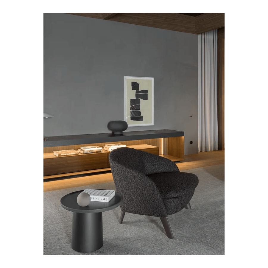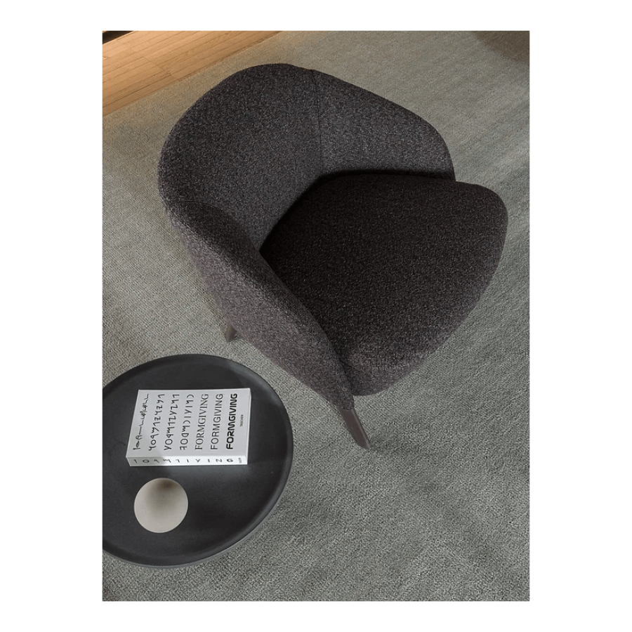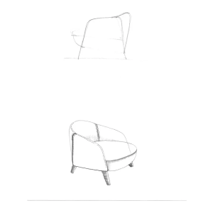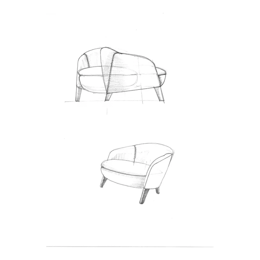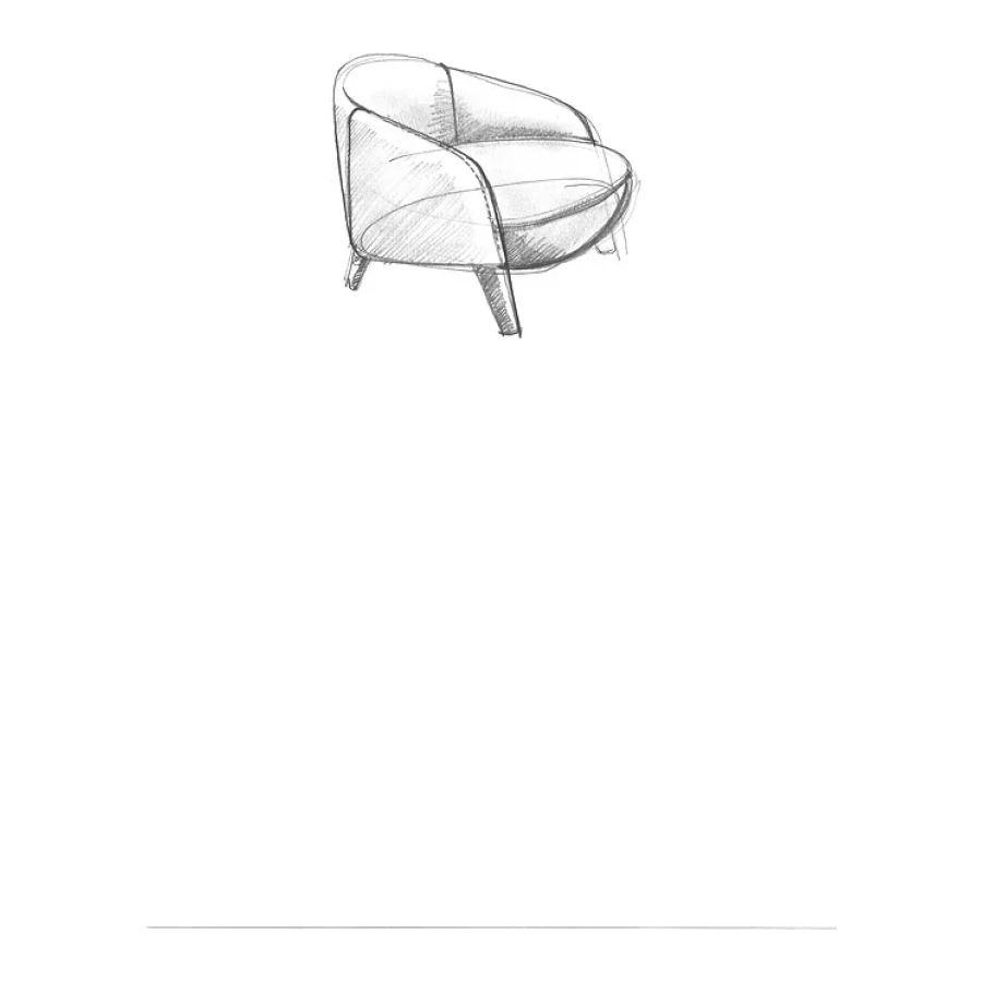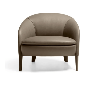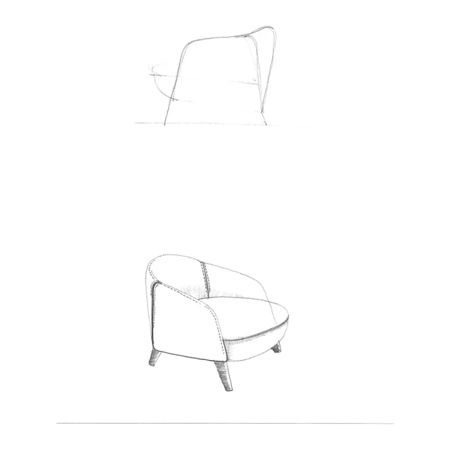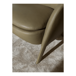 It is a small armchair featuring soft lines, designed to welcome the body and offer maximum comfort and relaxation. The back and arms are designed as a continuum that embraces both the sitter and the comfy seat with its additional little loose cushion. The frame ends with four slender legs covered in the leather variants of the Molteni&C range.