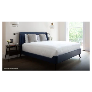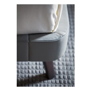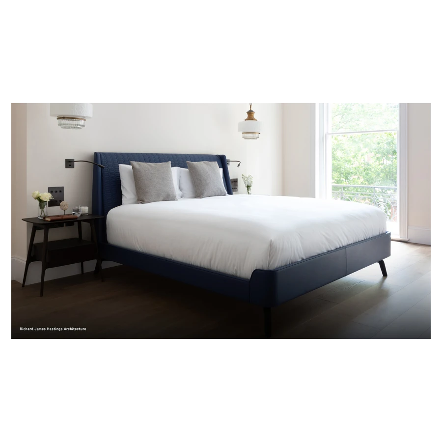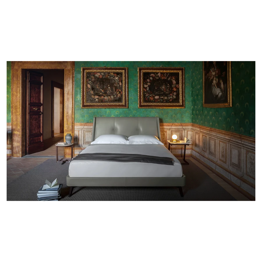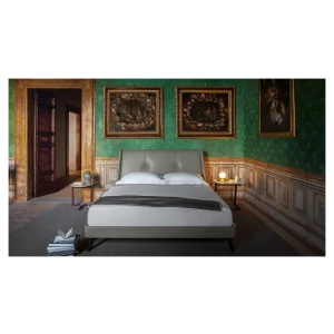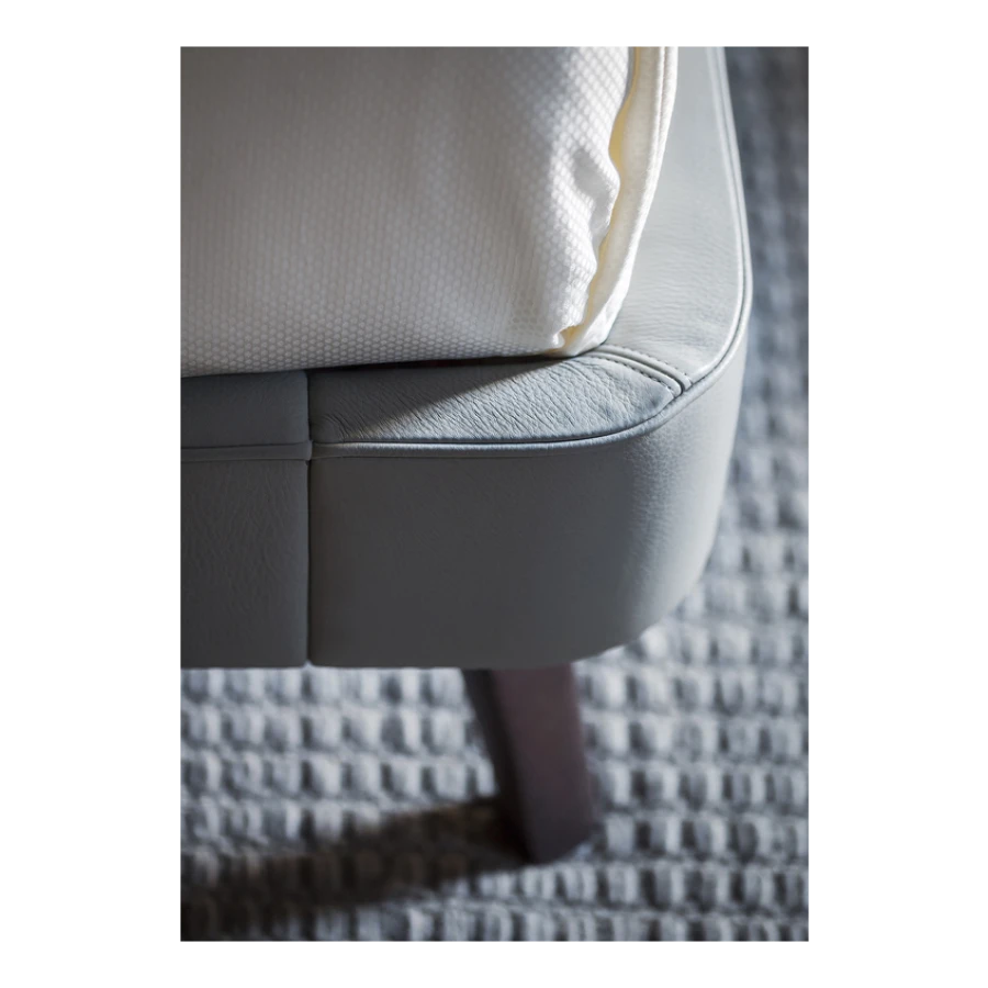 The headboard structure of the Suzie Wong bed is in solid beechwood and birch plywood with polyurethane foam padding. Three finishes are available: Suzie Wong, with smooth headboard, Suzie Wong Extra, with smooth headboard decorated with a couple of cylindrical buttons covered in tone-on-tone leather, and Suzie Wong De Luxe, with headboard decorated with geometric motif embroidery. The two moulded lateral parts are made from moulded polyurethane foam. Sides in tulip wood, lightly padded with polyurethane foam. Footboard in poplar plywood with the two corners in moulded polyurethane foam. The upholstery is in Pelle Frau® leather. As well as the tapered feet covered with leather, there is also a variant in solid ash with a moka or wenge stain. The footboard also comes in two versions: high or low, at the same level as the bed frame boards with which it forms a seamless surface.