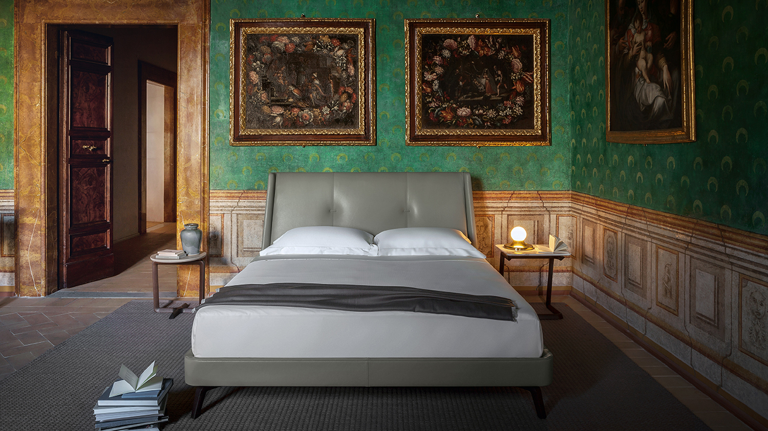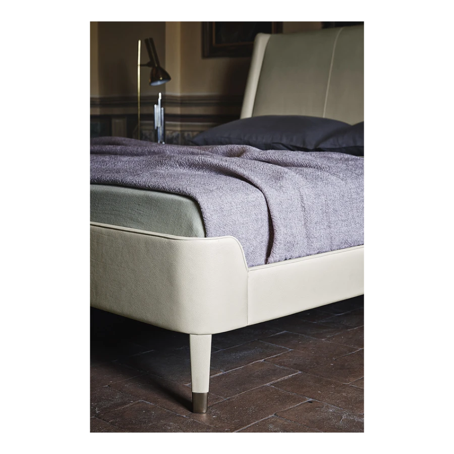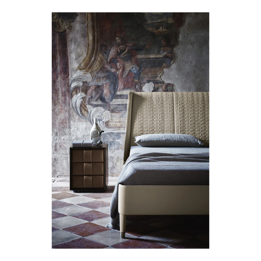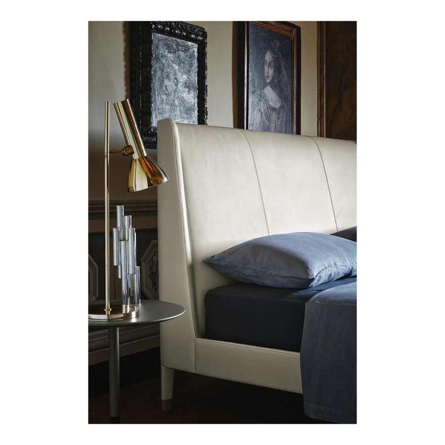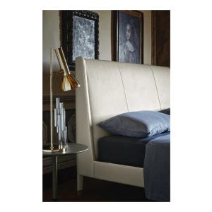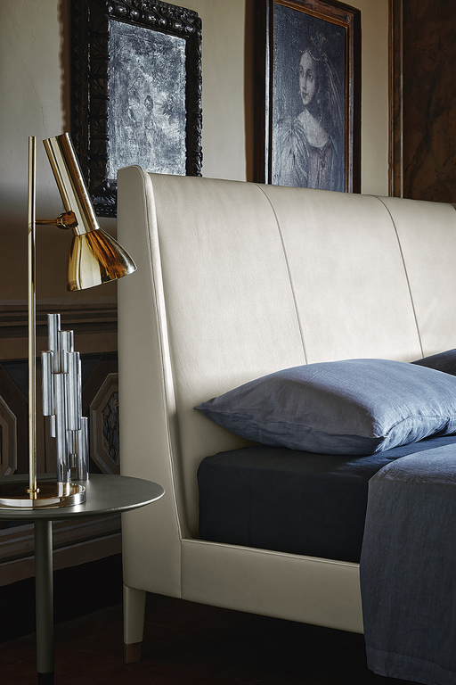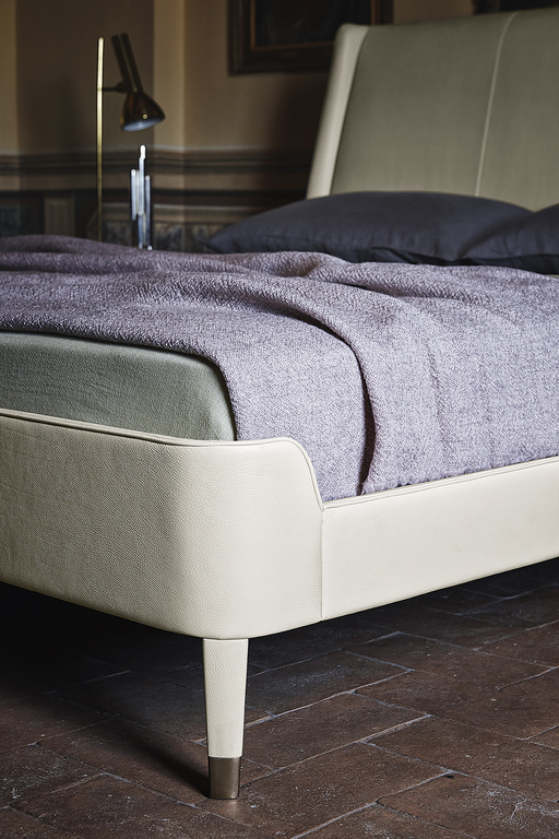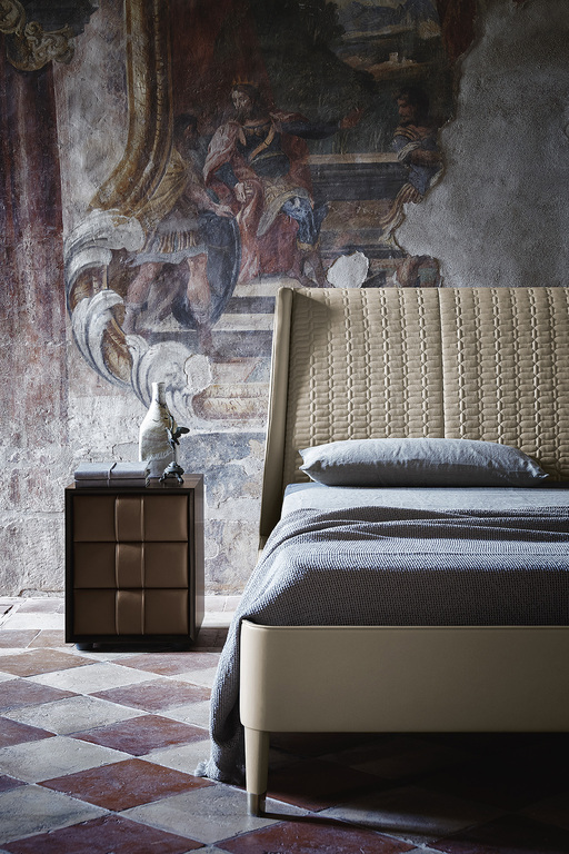The romantic comedies of the 1950’s and, going even further back, the sumptuous bedrooms of the 18th century. These are the inspiration for the Suzie Wong bed. Roberto Lazzeroni gives it a light, feminine, almost twee feel. Suzie Wong takes the classic boat bed and gives it a modern, more streamlined twist. The feet, tapered like stiletto heels and covered in leather with a brass tip, lift it from the floor and highlight its lightness. Even more sophisticated is the version with headboard enveloped in quilted leather which, embroidered with fine geometric stitching, is a subtle reference to typical details of tailored and leather goods.