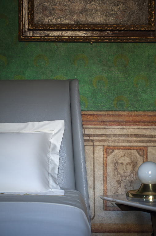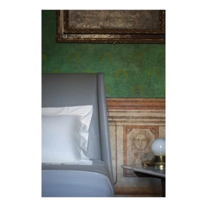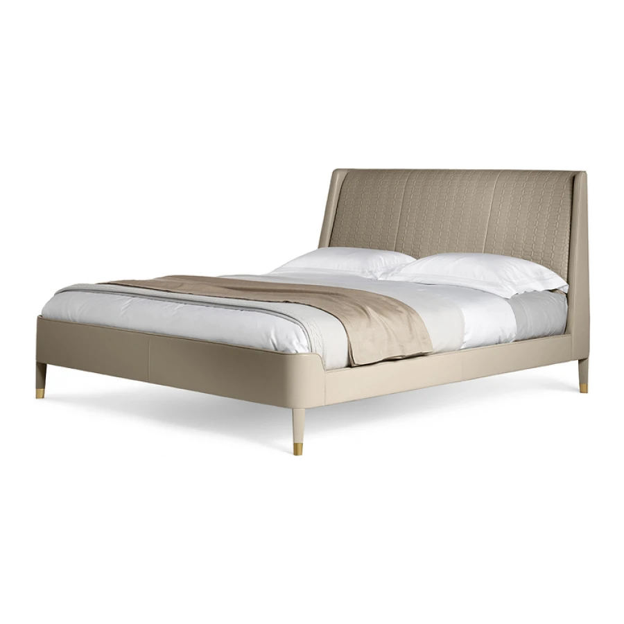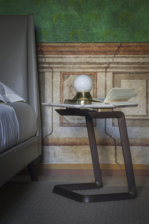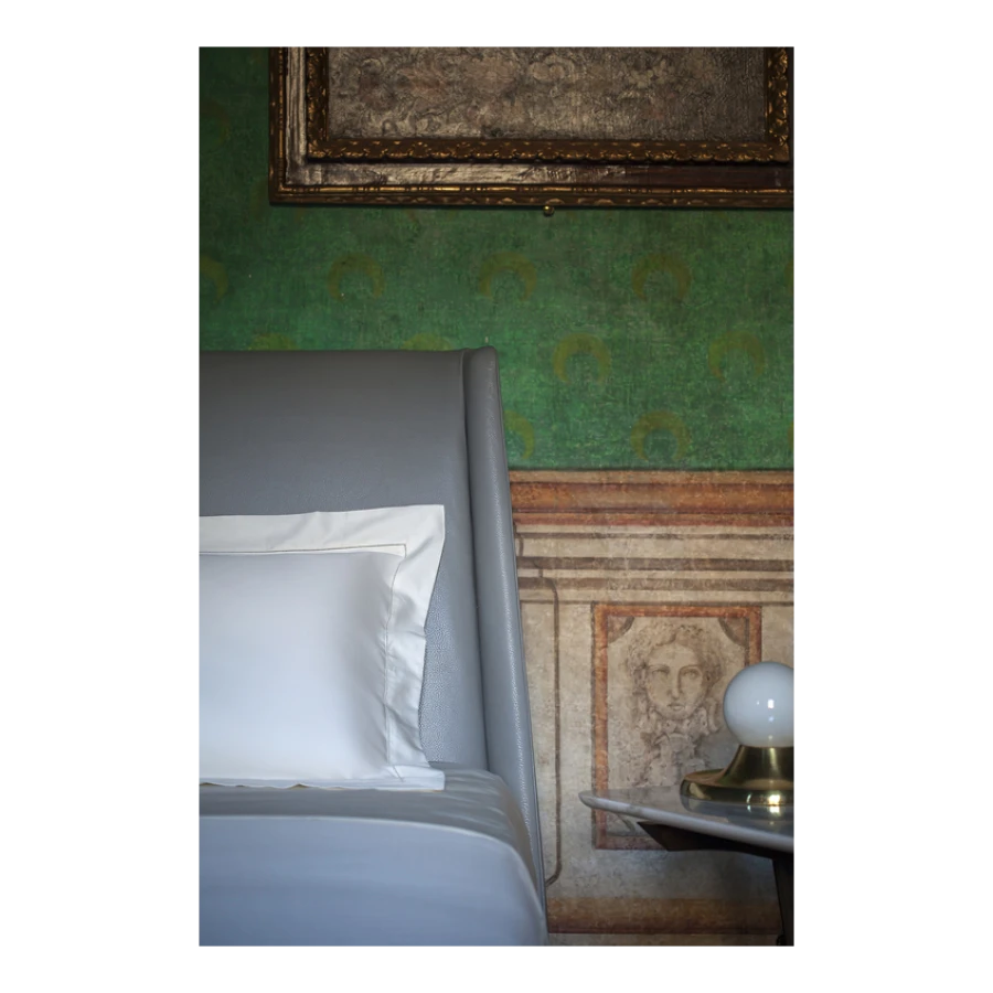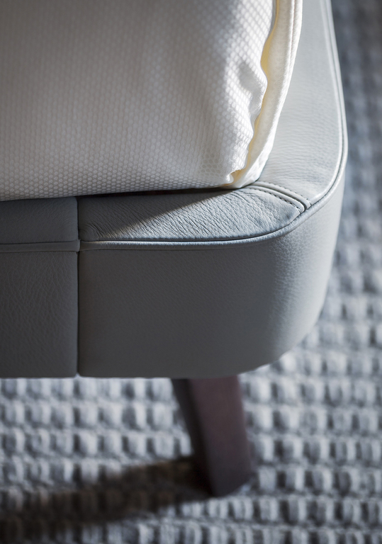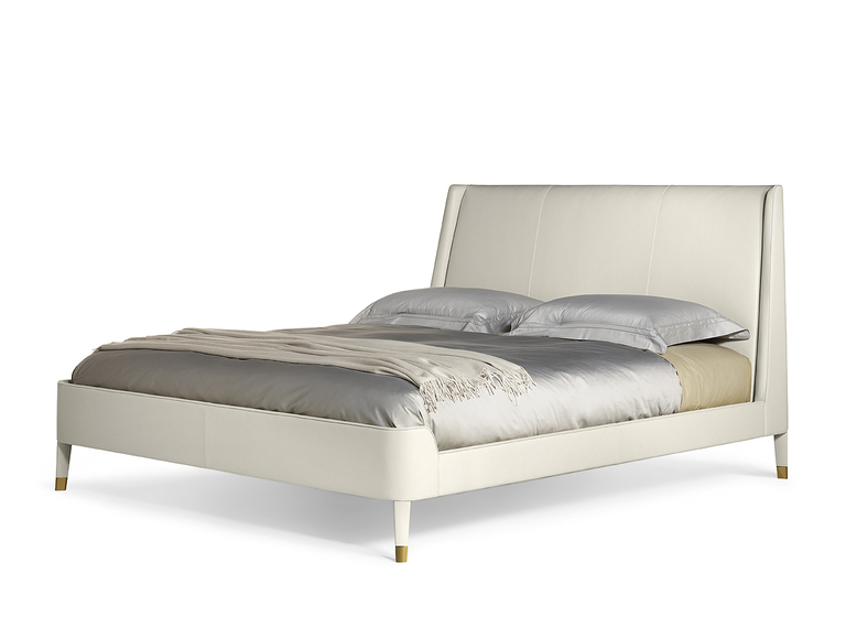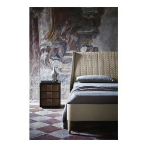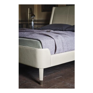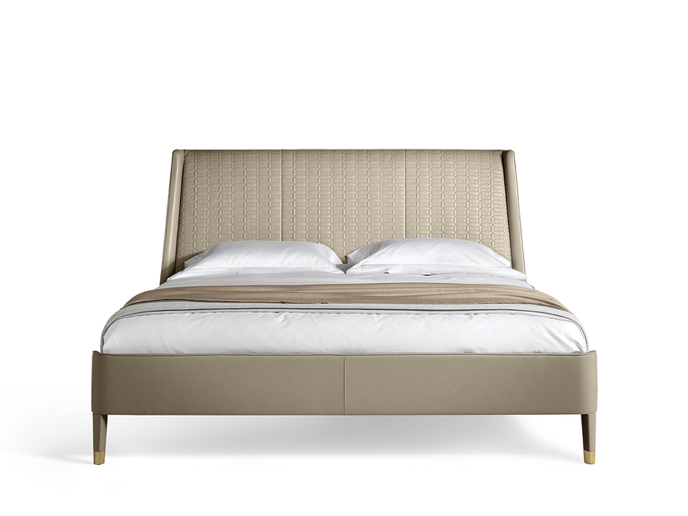 The romantic comedies of the 1950’s and, going even further back, the sumptuous bedrooms of the 18th century. These are the inspiration for the Suzie Wong bed. Roberto Lazzeroni gives it a light, feminine, almost twee feel. Suzie Wong takes the classic boat bed and gives it a modern, more streamlined twist. The feet, tapered like stiletto heels and covered in leather with a brass tip, lift it from the floor and highlight its lightness. Even more sophisticated is the version with headboard enveloped in quilted leather which, embroidered with fine geometric stitching, is a subtle reference to typical details of tailored and leather goods.