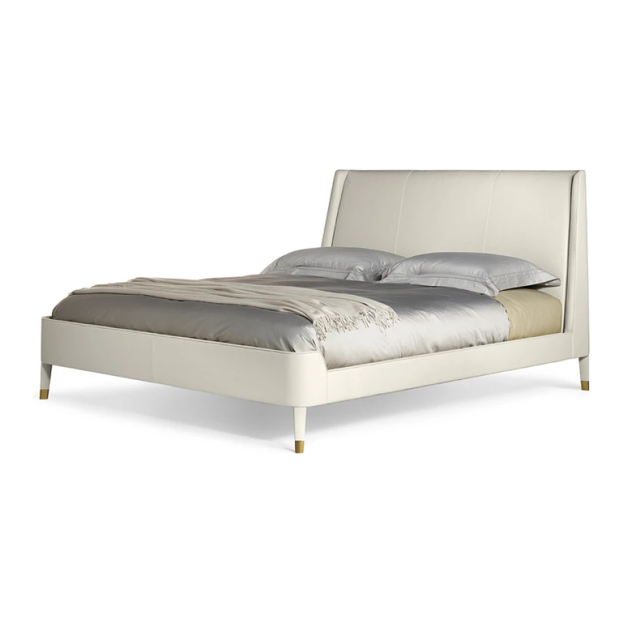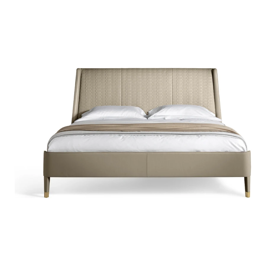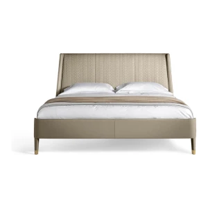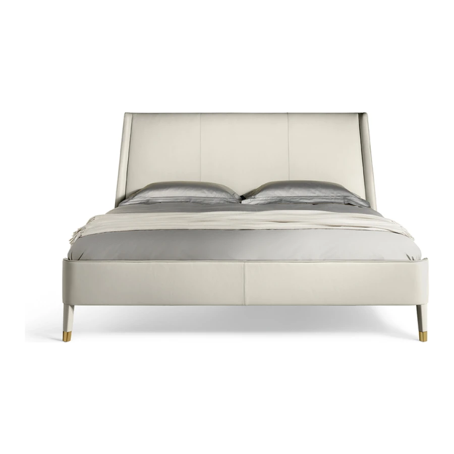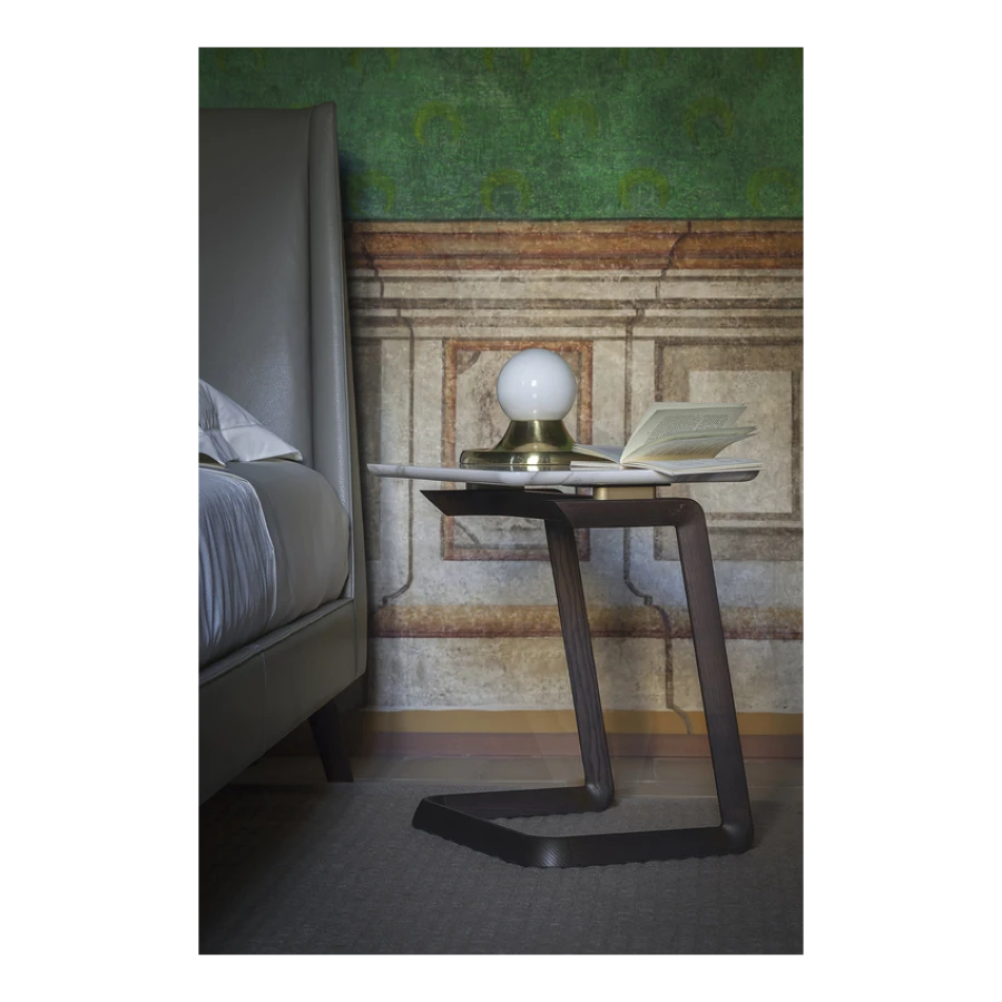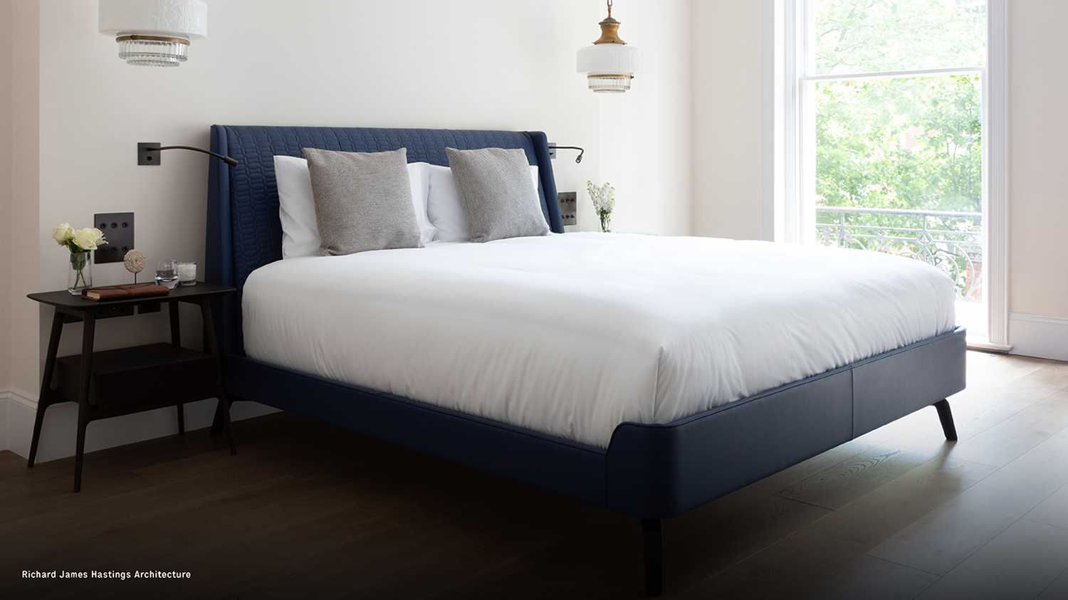 The romantic comedies of the 1950’s and, going even further back, the sumptuous bedrooms of the 18th century. These are the inspiration for the Suzie Wong bed. Roberto Lazzeroni gives it a light, feminine, almost twee feel. Suzie Wong takes the classic boat bed and gives it a modern, more streamlined twist. The feet, tapered like stiletto heels and covered in leather with a brass tip, lift it from the floor and highlight its lightness. Even more sophisticated is the version with headboard enveloped in quilted leather which, embroidered with fine geometric stitching, is a subtle reference to typical details of tailored and leather goods.
