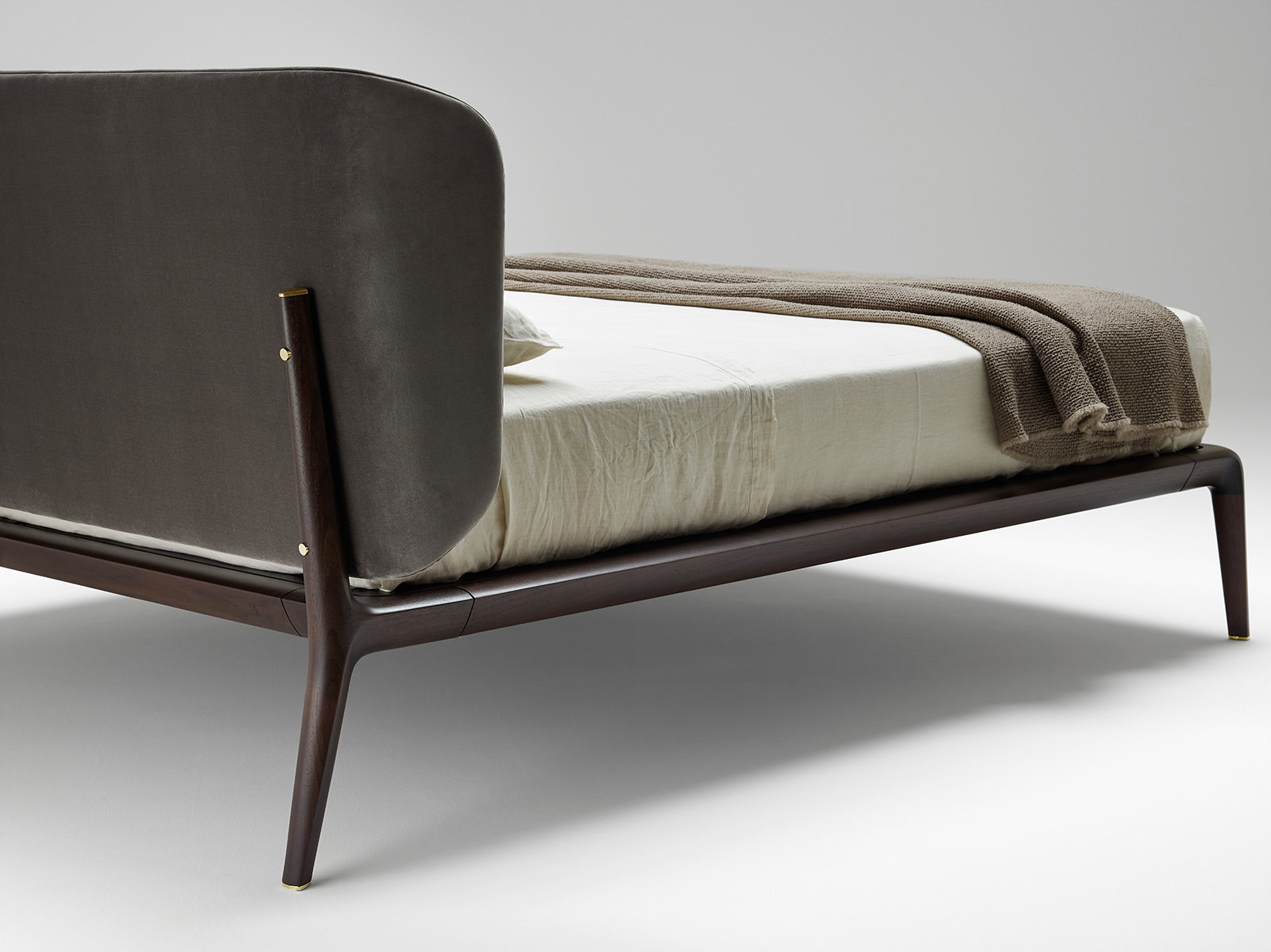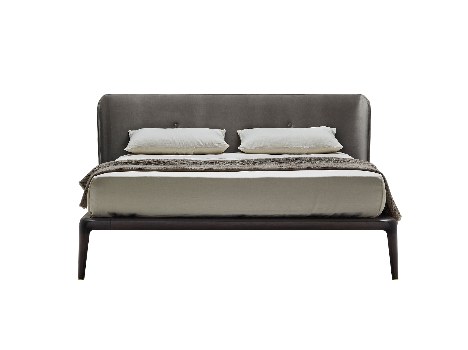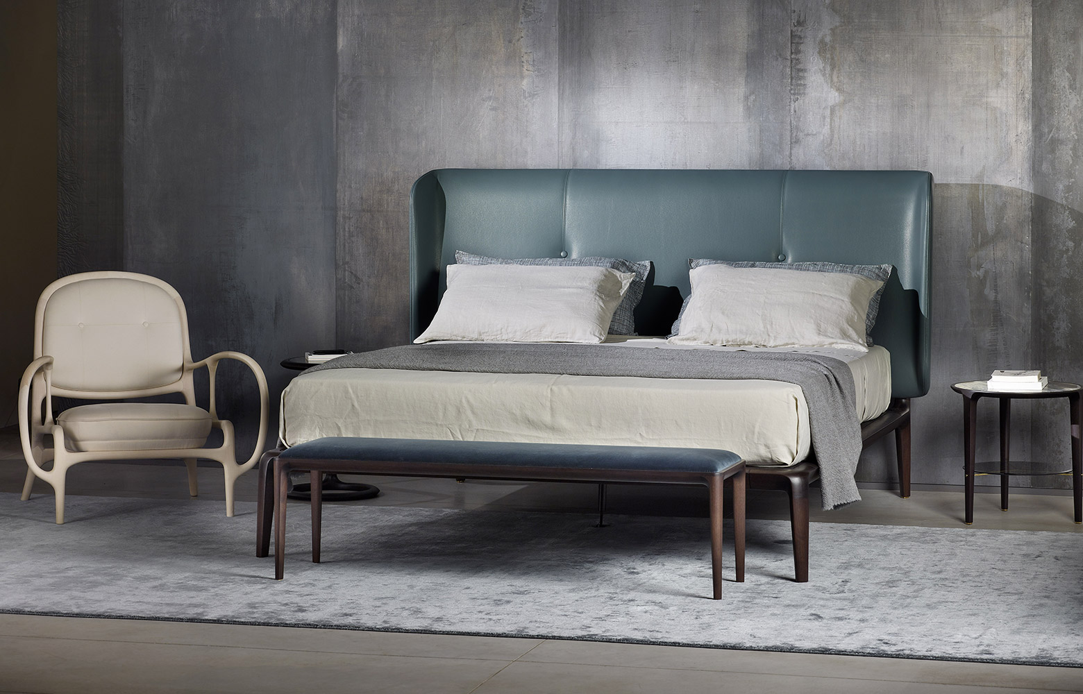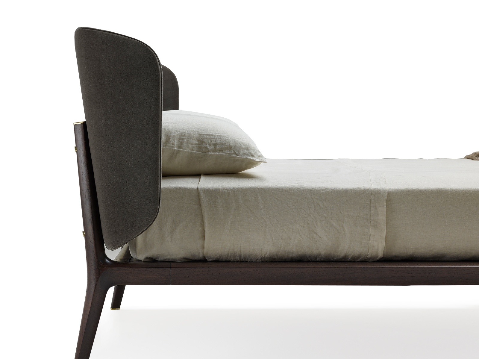 Sweet Dreams is a bed that loves contrasts: alternating with the soft lines of the wooden frame, the rigorous lines of the edges smoothly connect the horizontal load-bearing elements with the legs and the headboard supports. Delicate chiaroscuro effects leave space for the golden hues of the details in finely polished heavy brass. Sweet Dreams reiterates the company’s vocation for luxury craftsmanship, expressed, for example, in the sartorial detailing. The buttons are covered in fabric, leather or real leather with decorative piping that embellishes their profile. The careful study of the upholstery has made it possible to achieve excellent comfort without compromising the sleek and rigorous form of the edges. The name of the bed conveys the idea of relaxation and total abandon. The bedroom can be completed with the Sweet Dreams end-of-bed bench and the Sweet Dreams side table which can be used as a bedside table.