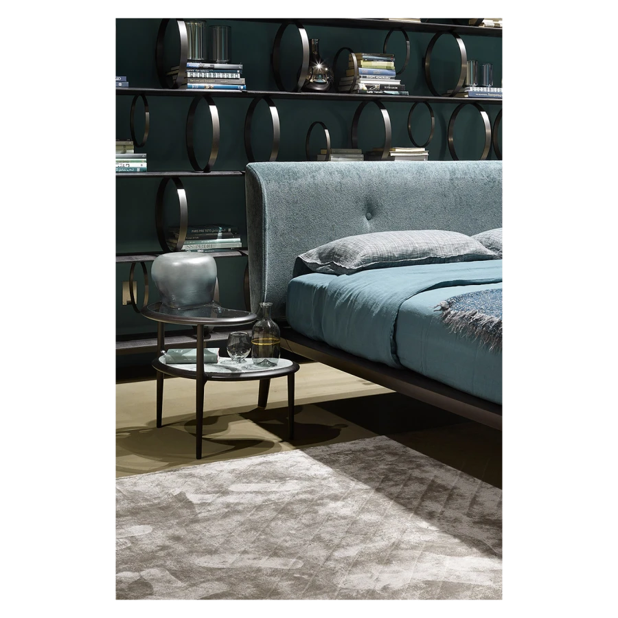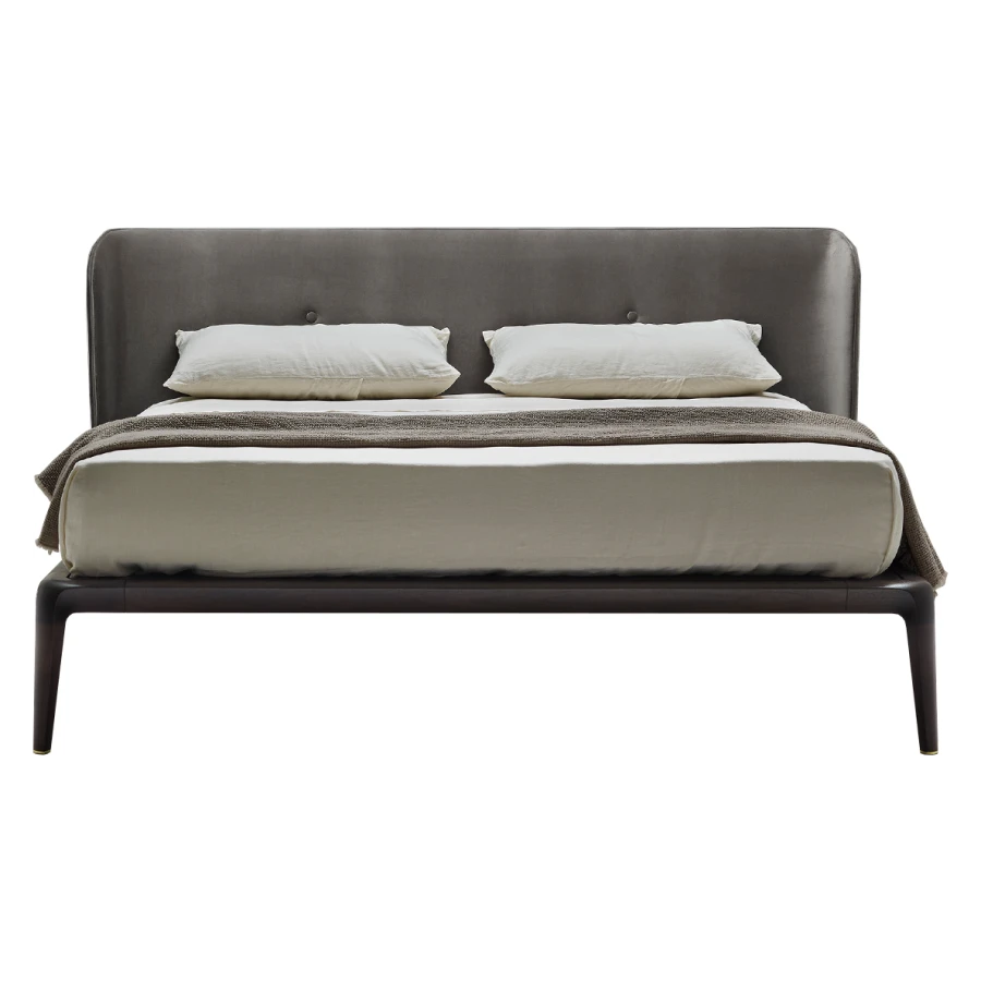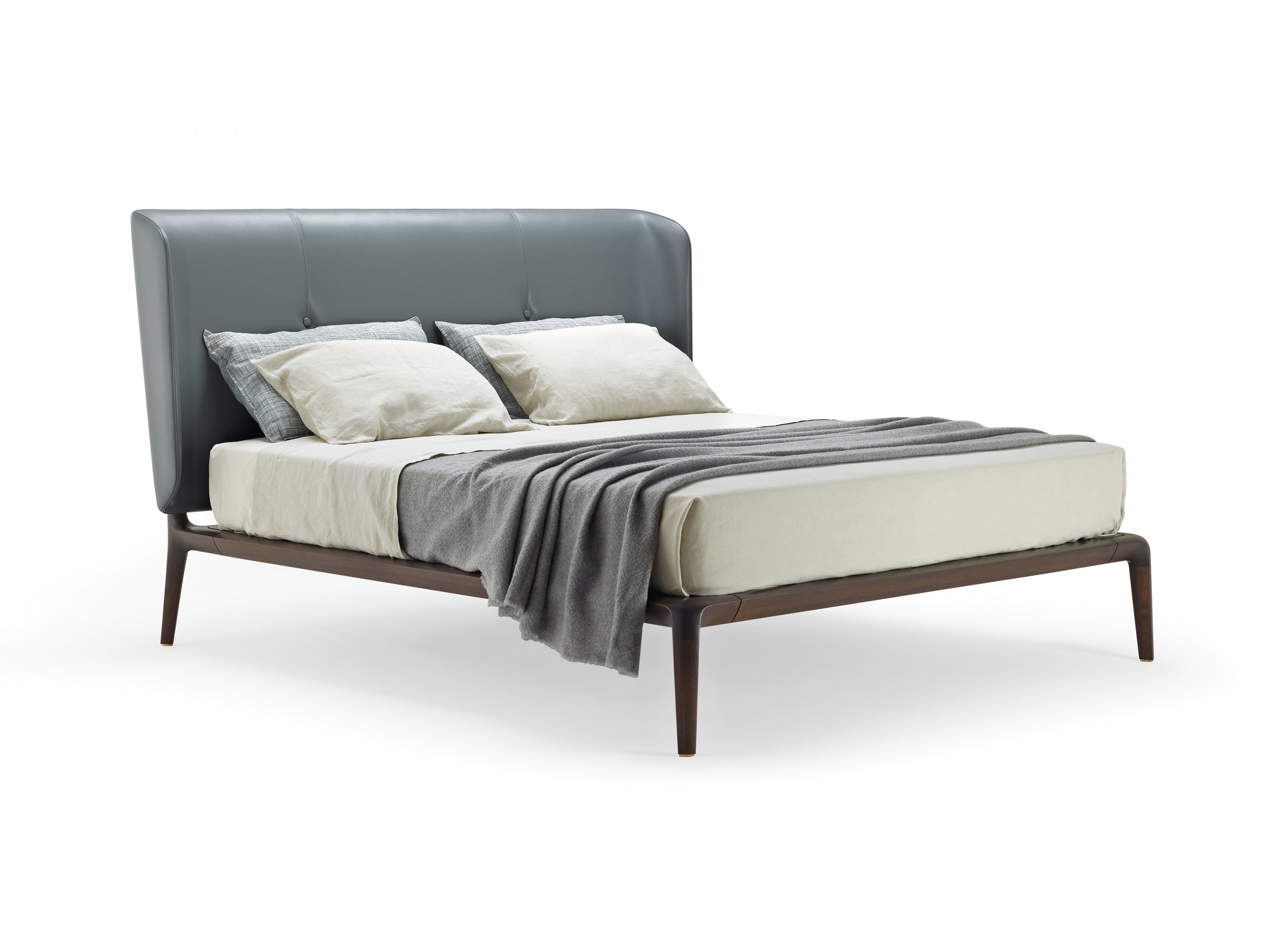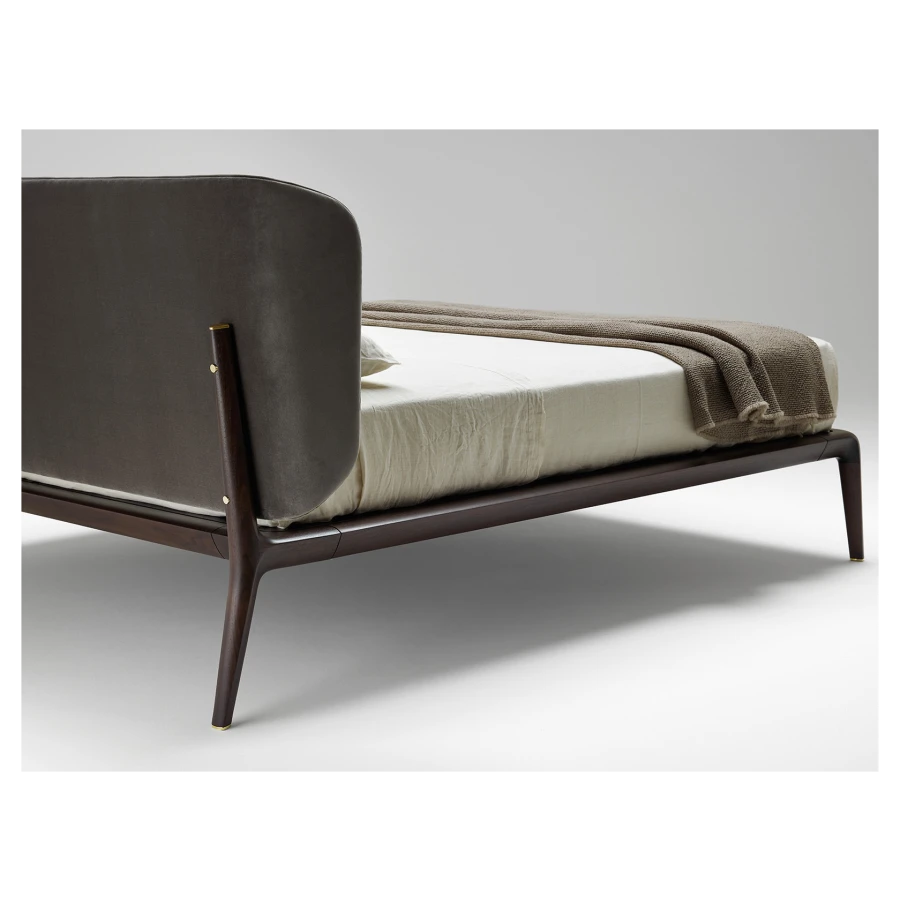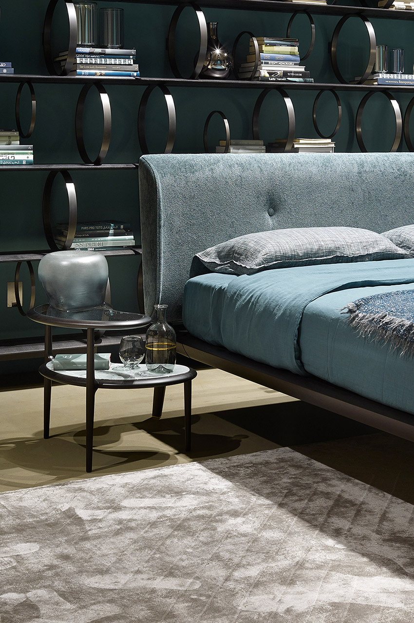 Sweet Dreams is a bed that loves contrasts: alternating with the soft lines of the wooden frame, the rigorous lines of the edges smoothly connect the horizontal load-bearing elements with the legs and the headboard supports. Delicate chiaroscuro effects leave space for the golden hues of the details in finely polished heavy brass. Sweet Dreams reiterates the company’s vocation for luxury craftsmanship, expressed, for example, in the sartorial detailing. The buttons are covered in fabric, leather or real leather with decorative piping that embellishes their profile. The careful study of the upholstery has made it possible to achieve excellent comfort without compromising the sleek and rigorous form of the edges. The name of the bed conveys the idea of relaxation and total abandon. The bedroom can be completed with the Sweet Dreams end-of-bed bench and the Sweet Dreams side table which can be used as a bedside table.