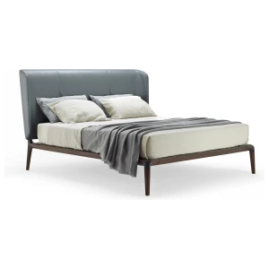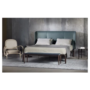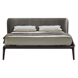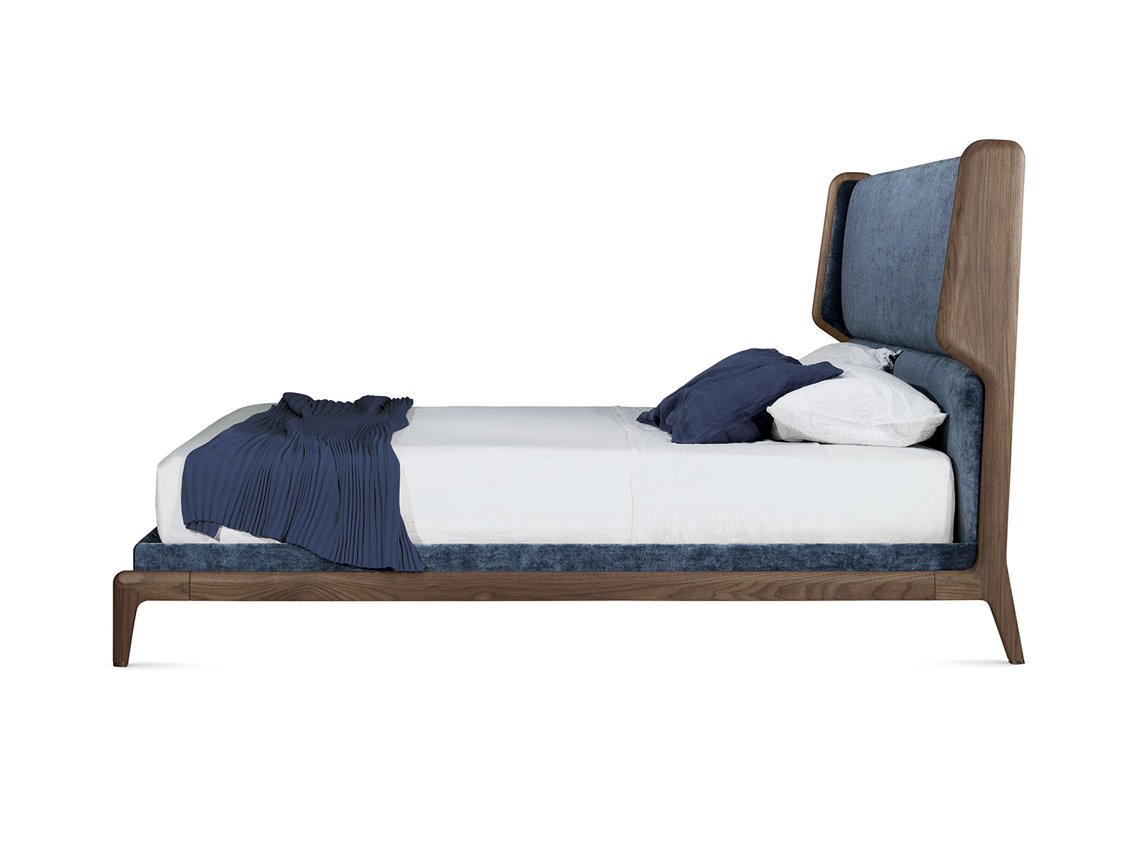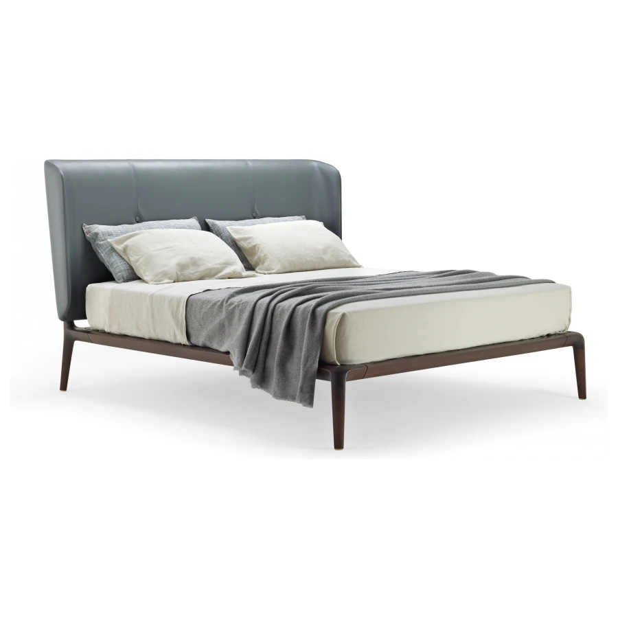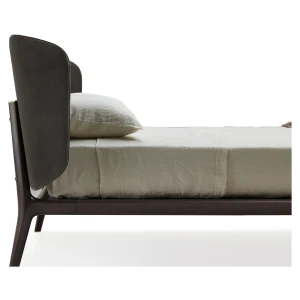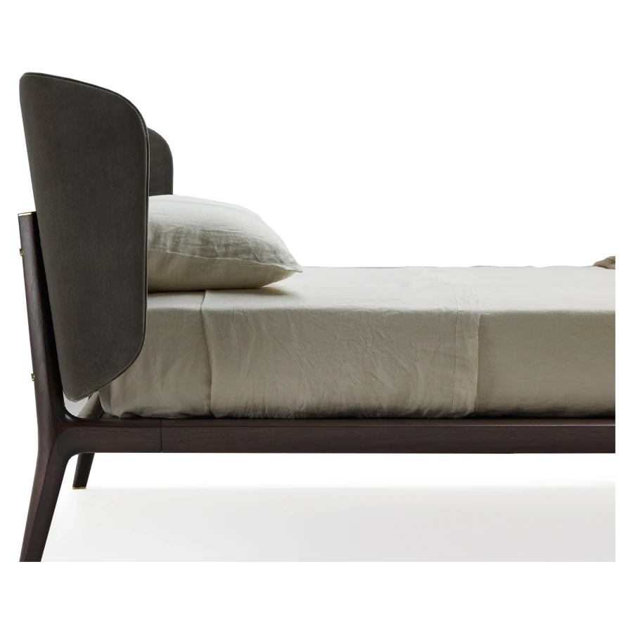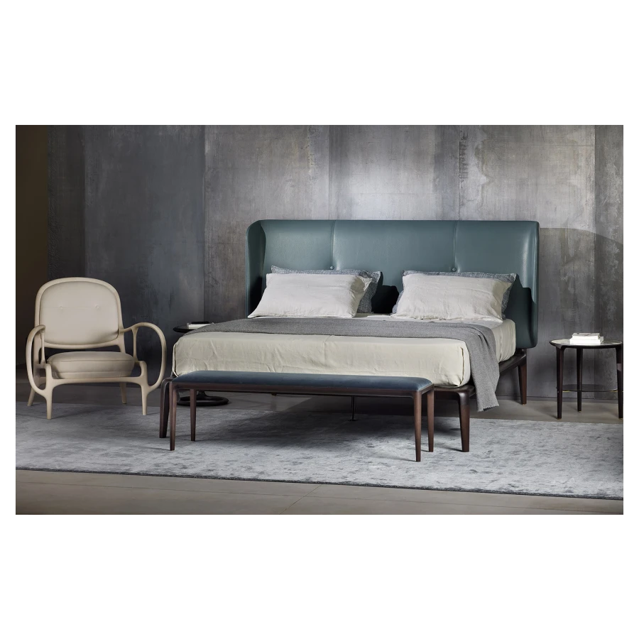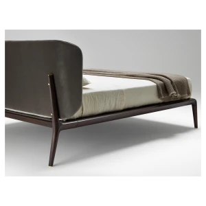 Sweet Dreams is a bed that loves contrasts: alternating with the soft lines of the wooden frame, the rigorous lines of the edges smoothly connect the horizontal load-bearing elements with the legs and the headboard supports. Delicate chiaroscuro effects leave space for the golden hues of the details in finely polished heavy brass. Sweet Dreams reiterates the company’s vocation for luxury craftsmanship, expressed, for example, in the sartorial detailing. The buttons are covered in fabric, leather or real leather with decorative piping that embellishes their profile. The careful study of the upholstery has made it possible to achieve excellent comfort without compromising the sleek and rigorous form of the edges. The name of the bed conveys the idea of relaxation and total abandon. The bedroom can be completed with the Sweet Dreams end-of-bed bench and the Sweet Dreams side table which can be used as a bedside table.