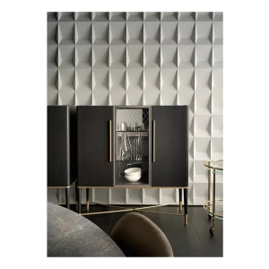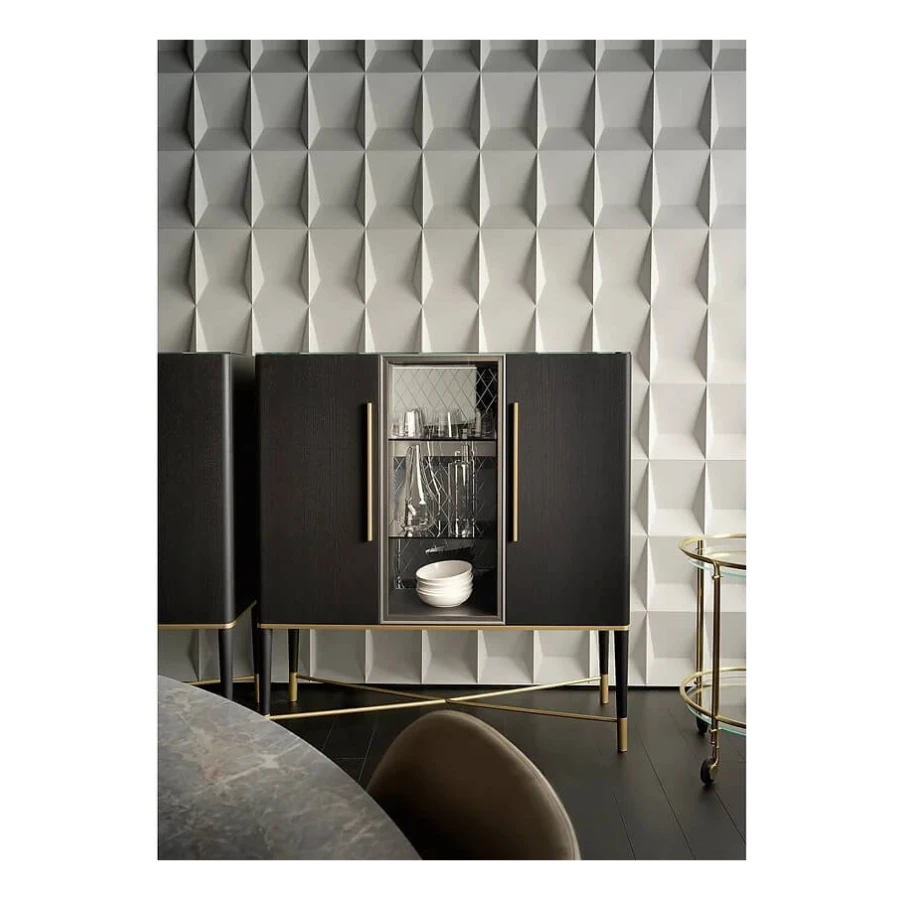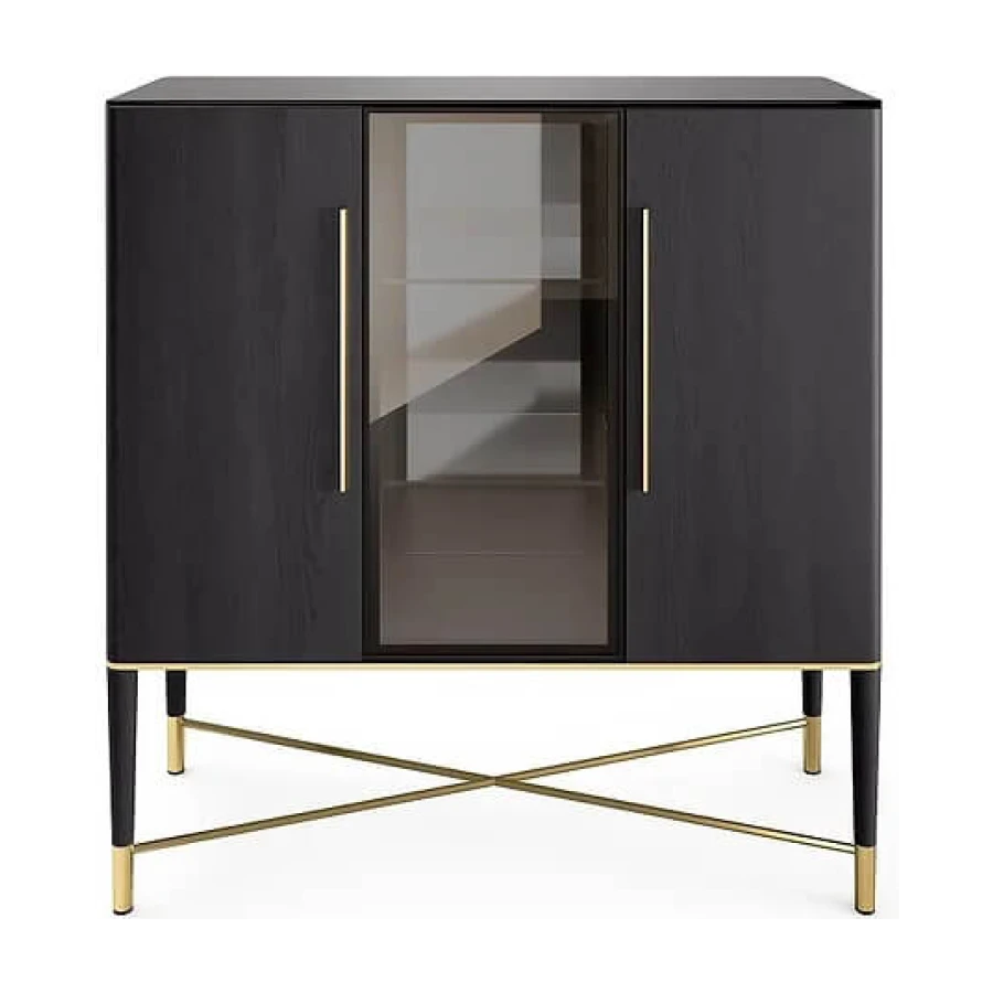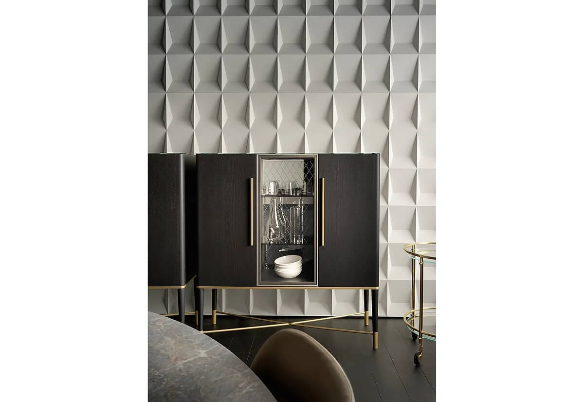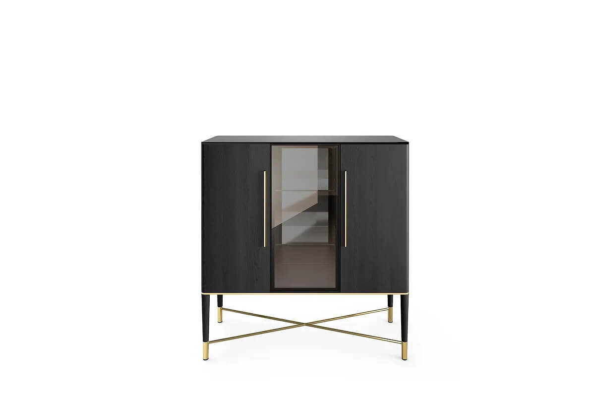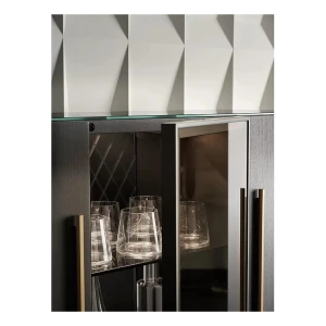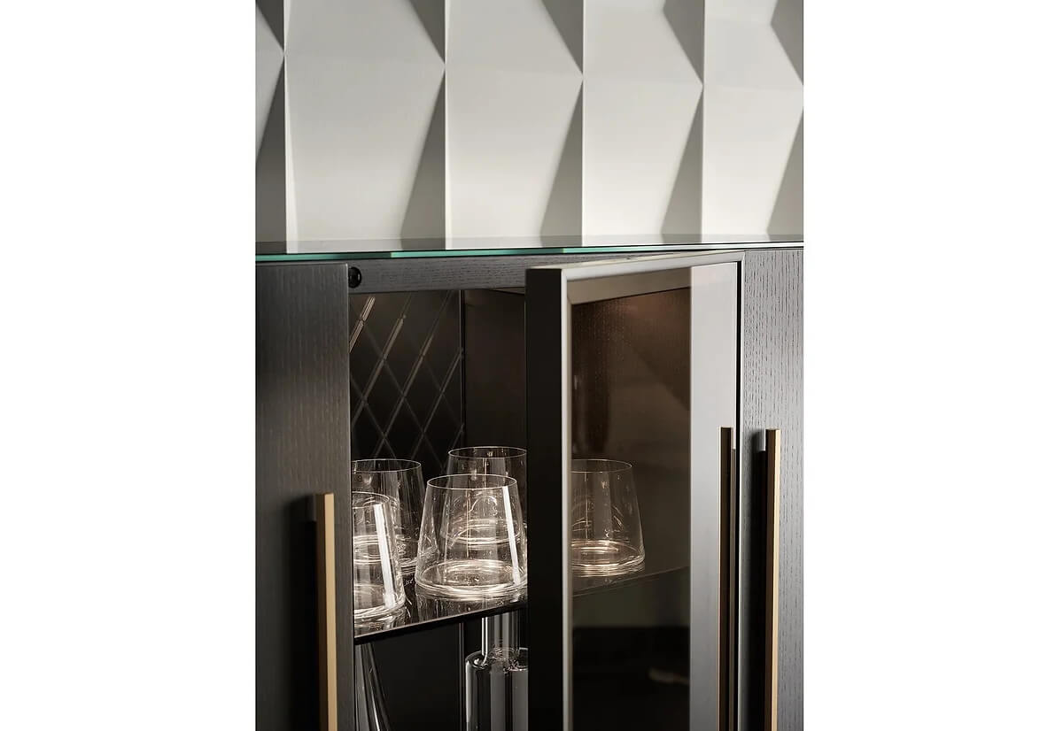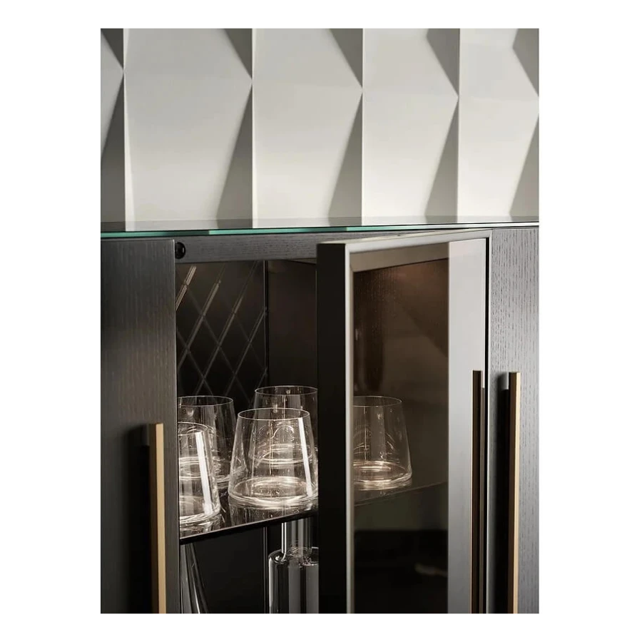 Sideboard in black open pore lacquered ash. Satin brass lacquered metal parts. 6mm bright liquorice painted tempered glass top and inside back. Rhomboidal engraved pattern on the inside glass back. Supplied with 8mm tempered smoked “grigio Italia” glass shelves. Central door in glass and aluminium in the colour bronze. With LED light (15 Watt).