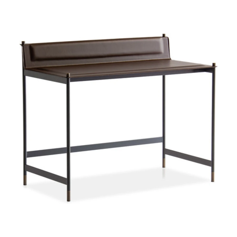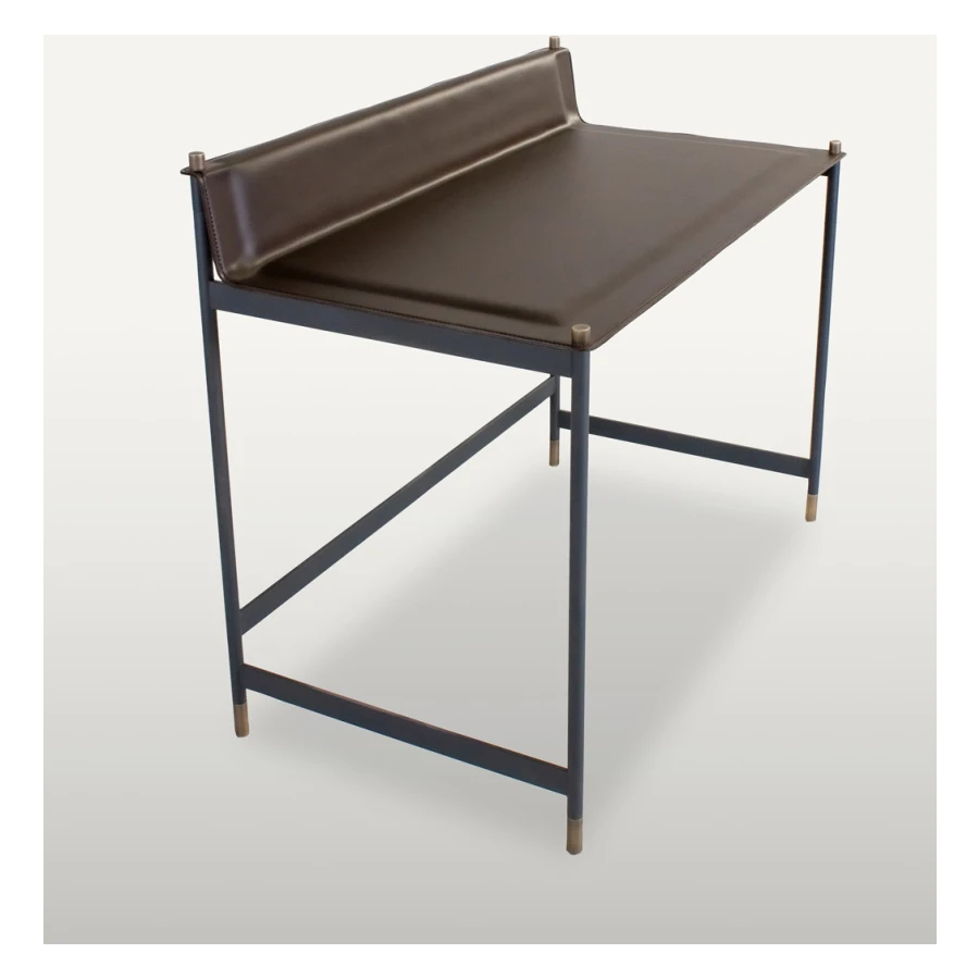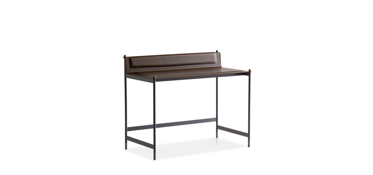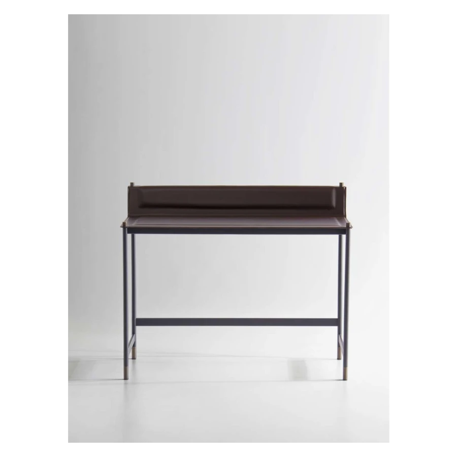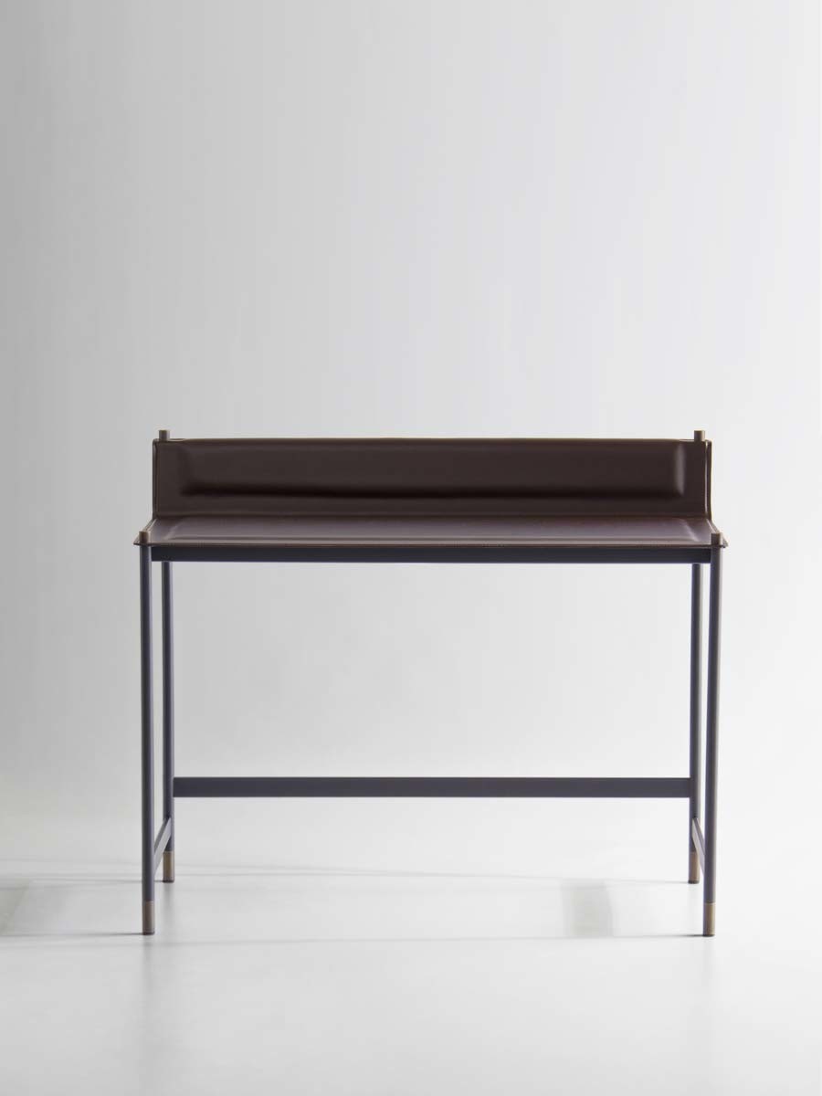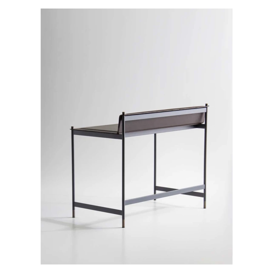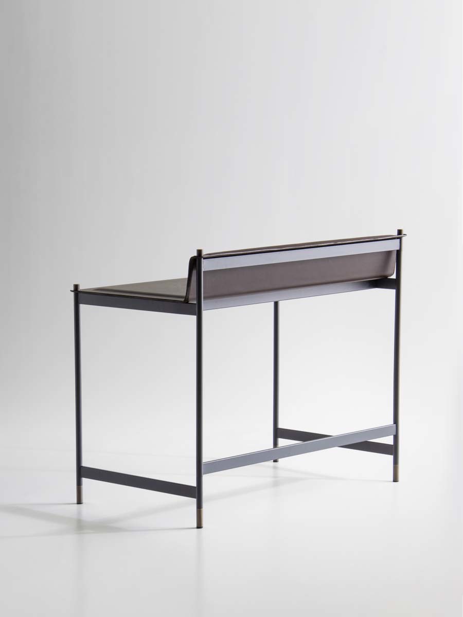 It has a structure in powder coated tubular steel in embossed anthracite, with feet and cylindrical fixing details in bronzed brass finish. Top and shoulder in thin plate, with soft polyurethane foam pad insert, covered with hide-leather, and refined with visible perimeter seams.