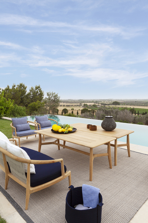 The Secret Garden fulfils contemporary needs and an increasingly free use of outdoor furnishings. It has been designed for three functions: to furnish the relaxation area, with comfortable loungers and small tables, to create a comfortable dining area, thanks to the large table and armchairs, and for a more informal lounge dining area, where you can sit on the two-seater sofa or on the comfortable armchairs, with the large low table at your fingertips. The curved contours of the wood, the soft to the touch fabric covering the cushions, and the delicate tones of the hand-finished enamelled stoneware on the table tops are all elements featuring exquisite workmanship, a level of quality and manufacturing expertise rarely found in outdoor furnishings.