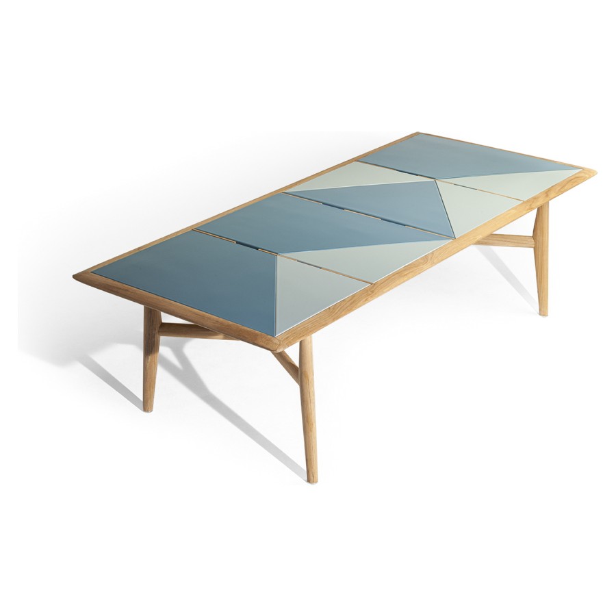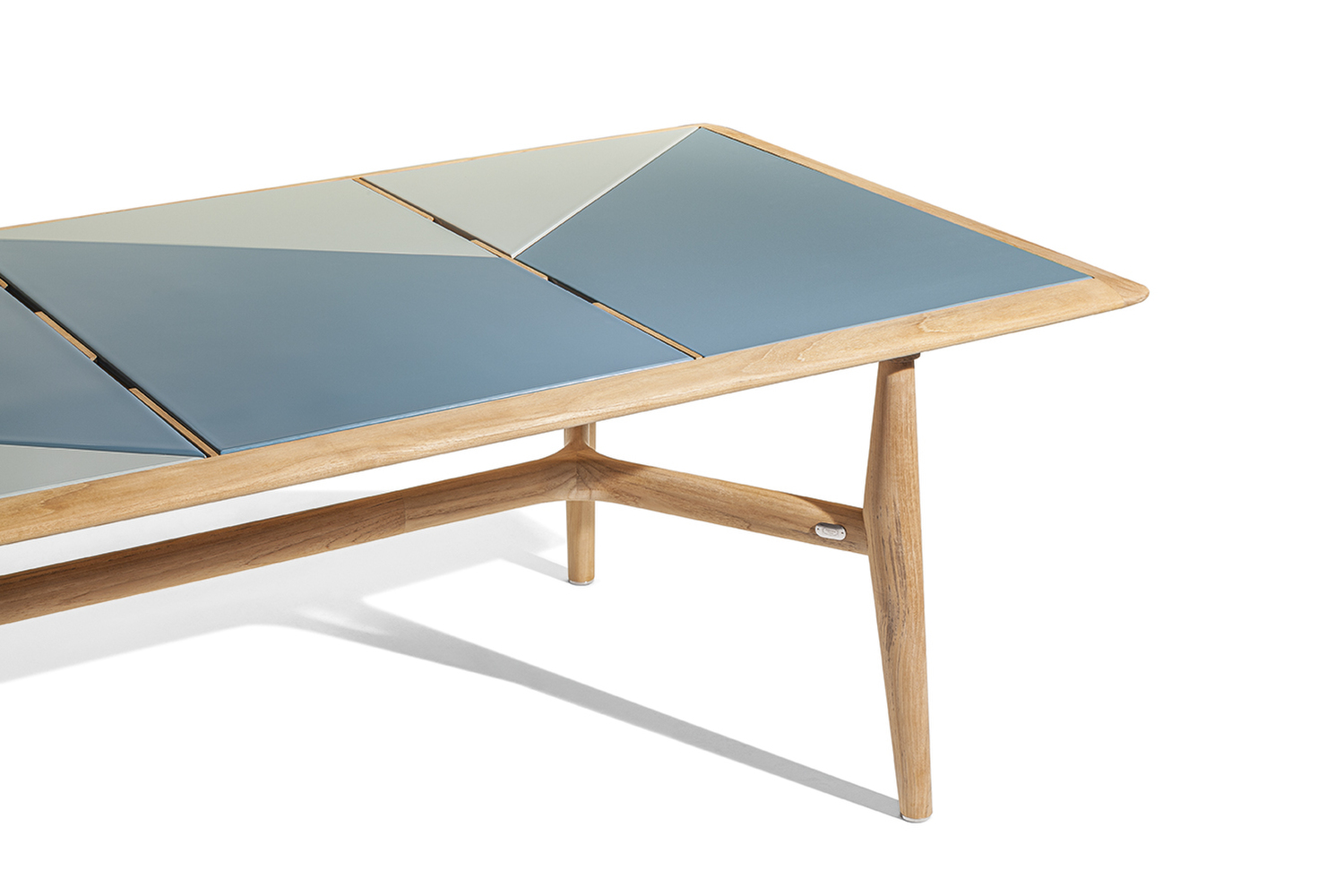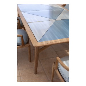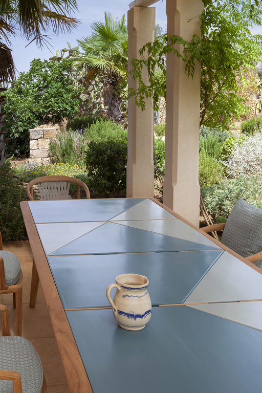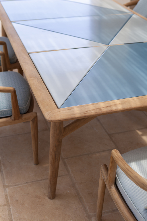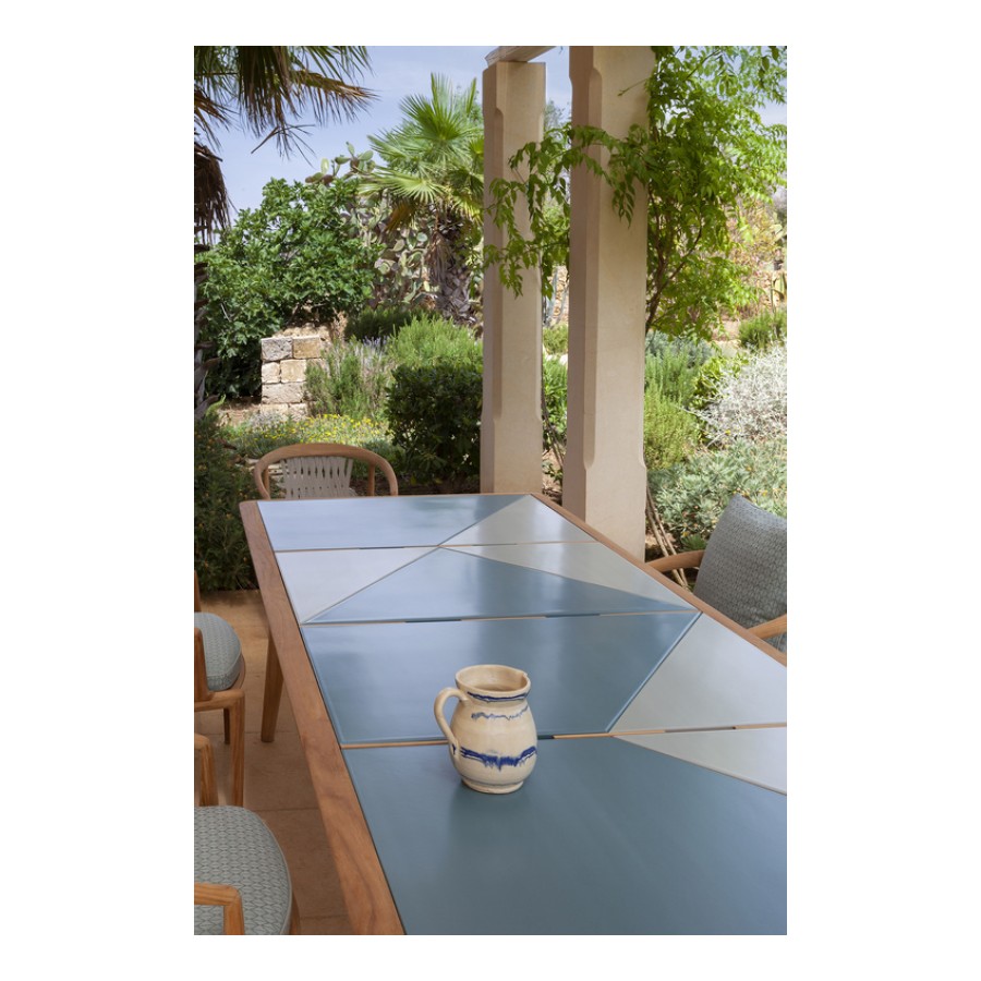 Practicality combined with master craftsmanship. The teak wood outdoor dining table in a natural finish furnishes spaces on the border between indoors and outdoors, such as patios and verandas, to more open air settings, such as gardens, terraces and decks of yachts and ships, in both residential and contract settings. The table has generous dimensions and a structure designed with narrow, organic sections. The top is made of two-tone panels in two colour combinations of hand-crafted glazed stoneware, a material typical of Mediterranean design and tradition, and highly resistant to adverse weather conditions. The table is part of the outdoor collection The Secret Garden, designed by Roberto Lazzeroni, which completes the Poltrona Frau Boundless Living Outdoor Collections. The Secret Garden table is made of FSC™ 100% -certified wood.