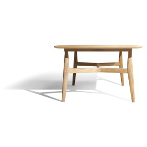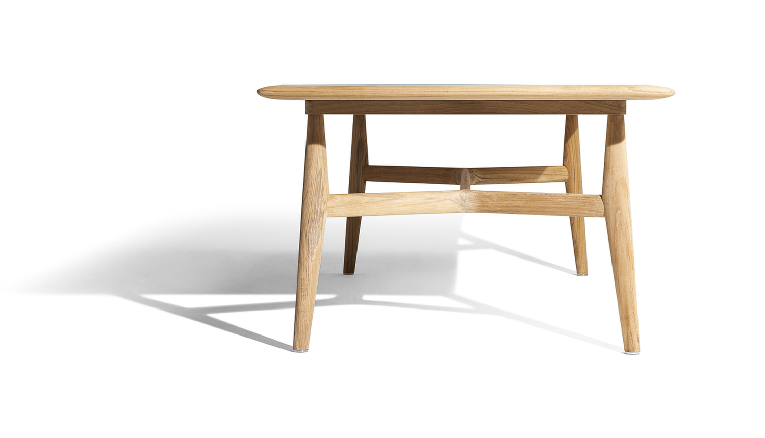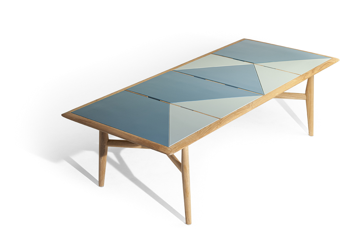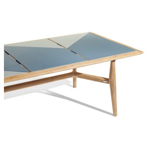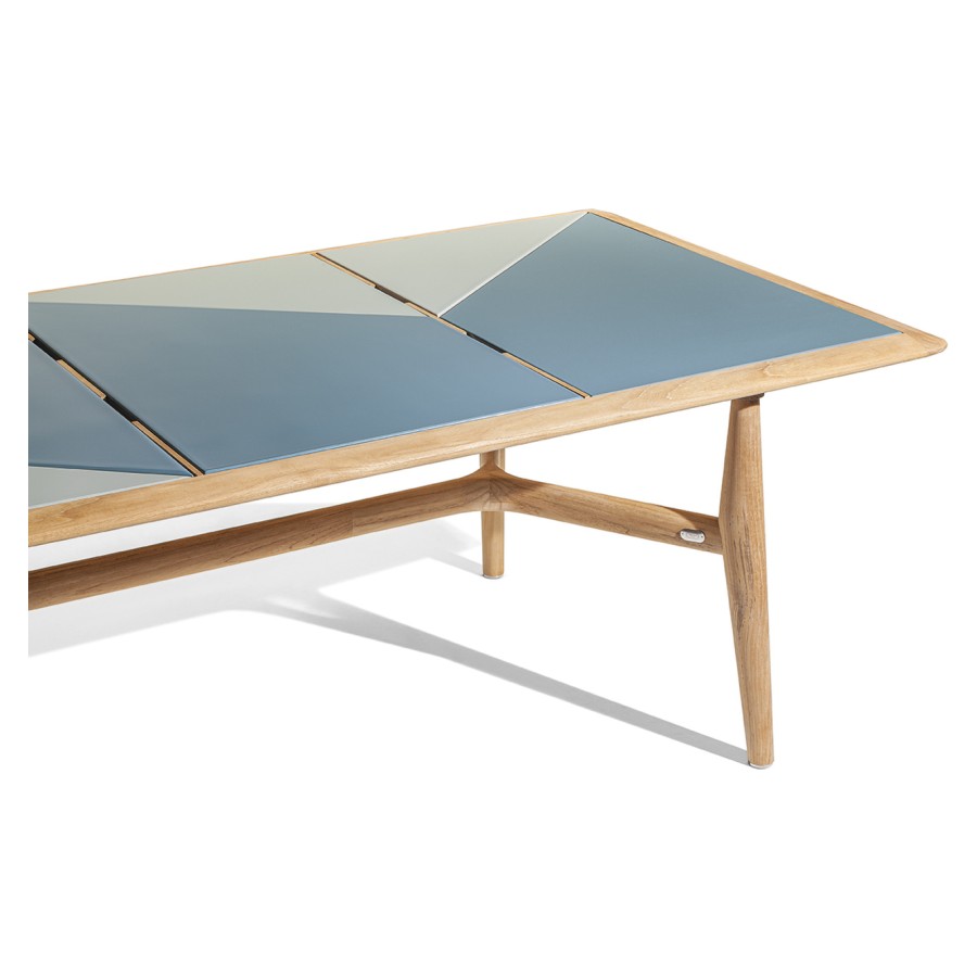 Practicality combined with master craftsmanship. The teak wood outdoor dining table in a natural finish furnishes spaces on the border between indoors and outdoors, such as patios and verandas, to more open air settings, such as gardens, terraces and decks of yachts and ships, in both residential and contract settings. The table has generous dimensions and a structure designed with narrow, organic sections. The top is made of two-tone panels in two colour combinations of hand-crafted glazed stoneware, a material typical of Mediterranean design and tradition, and highly resistant to adverse weather conditions. The table is part of the outdoor collection The Secret Garden, designed by Roberto Lazzeroni, which completes the Poltrona Frau Boundless Living Outdoor Collections. The Secret Garden table is made of FSC™ 100% -certified wood.