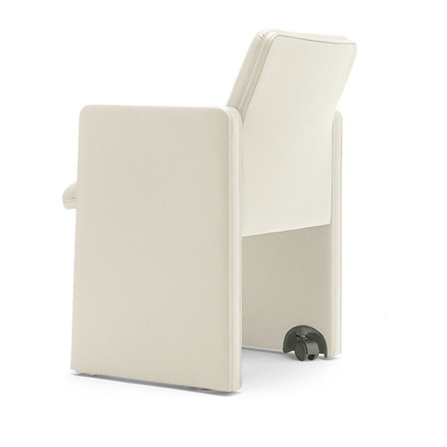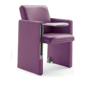 The supporting structure of the THF chair is in solid beech wood with MDF panels. Padding in fire-resistant non-deforming polyurethane. Upholstery in Pelle Frau® leather or fabric. THF is available with one-way front castors and swivel or one-way rear castors, or with slides. Optional: fastening system and foldaway writing table.