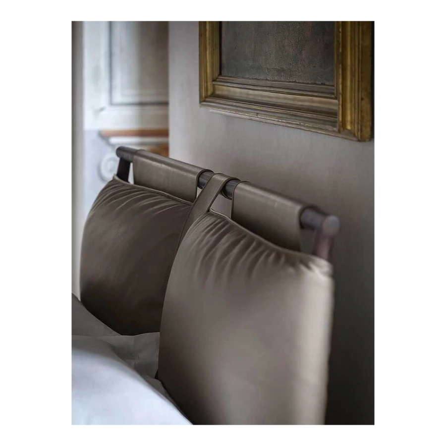 The headboard of the Times bed is an evocative combination of leather, wood and fabrics of the customer’s choosing. The headboard structure, in solid ash, is a pure meeting of lines, expertly designed to support the vertical strips of Pelle Frau® leather. These, in turn, cross and divide the soft and generous horizontal cushion. The effect is a calm balance of solids and voids. The Times bed is also the freedom to change appearance with just a few quick moves. It is possible to change the colour and material of the large headboard cushion cover, which can also be purchased individually, choosing from Pelle Frau® leather or fabric. The cushion is padded with polyurethane foam and polyester wadding. The footboard of the Times bed is in poplar plywood and the sides in spruce blockboard, all of which with light polyurethane foam padding and Pelle Frau® leather upholstery. The feet are made from solid ash in a Moka stain.