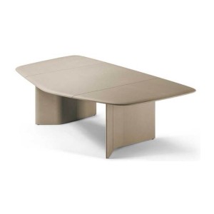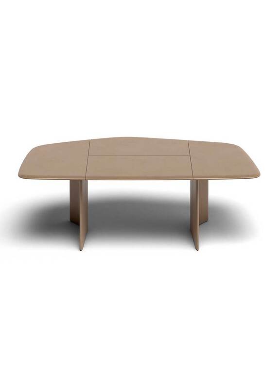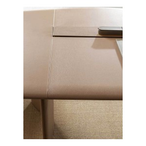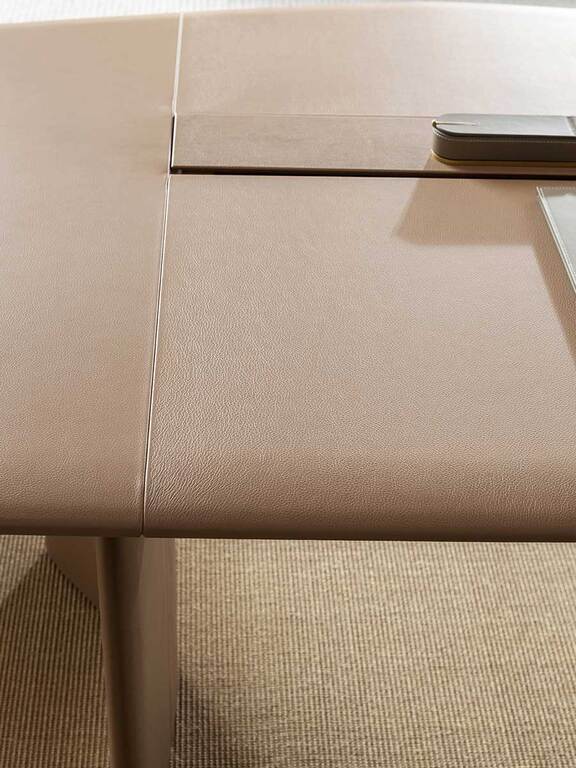The available finishes showcase the slender and light geometries of the tops. The latter can be accessorised with cable tidies or, in the leather version, with a cable management door.