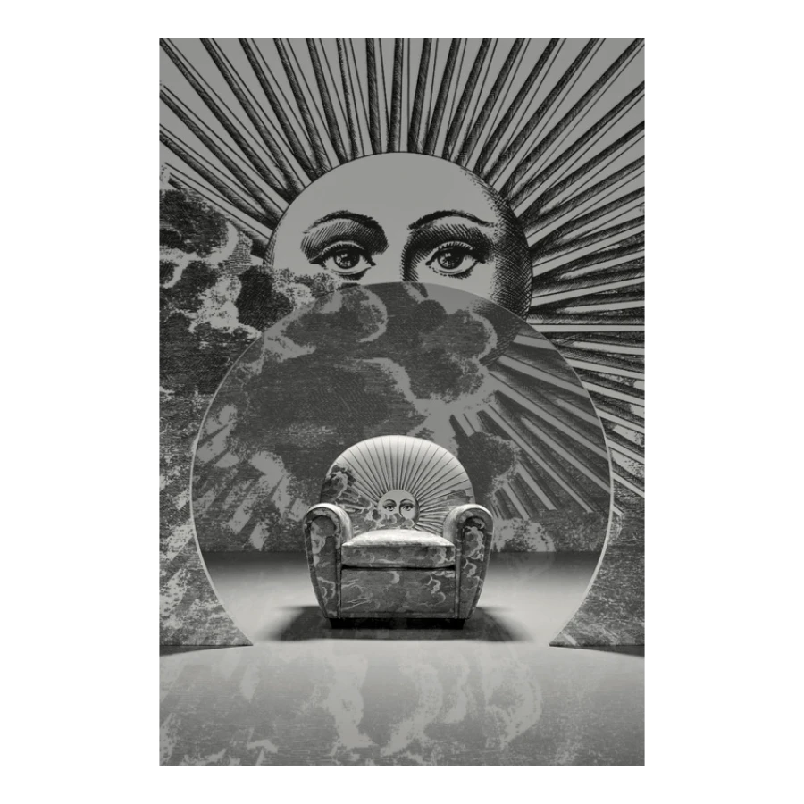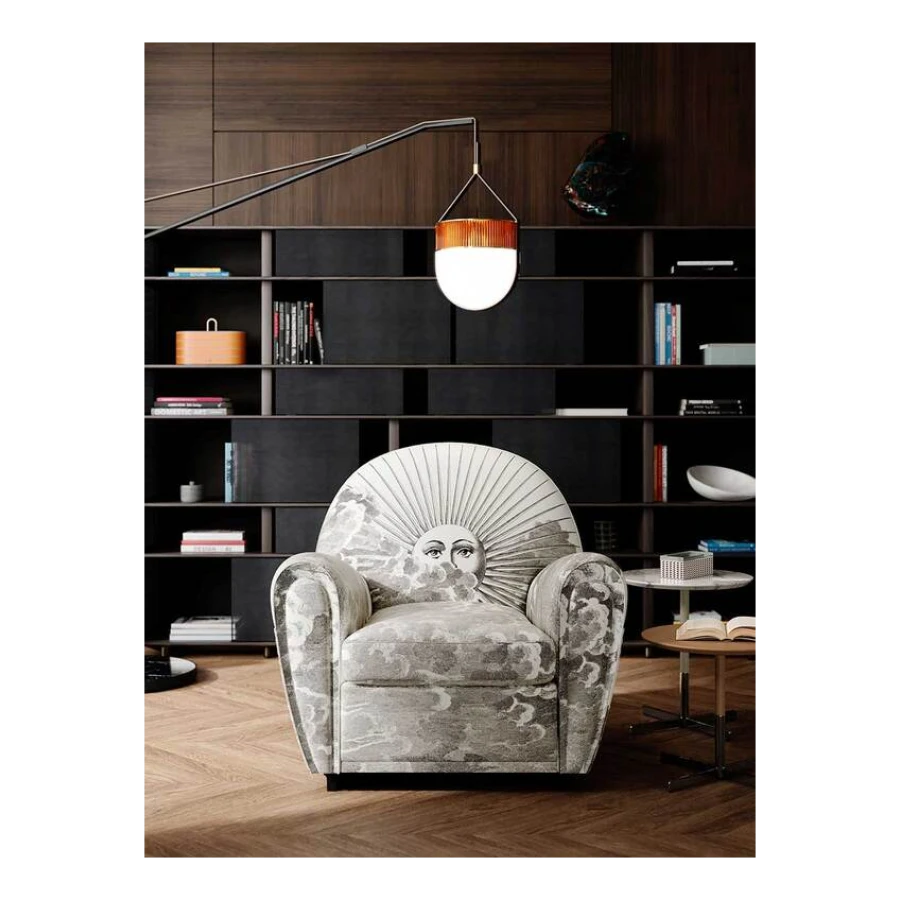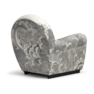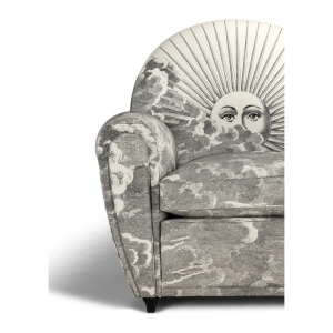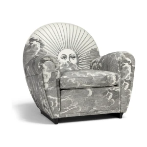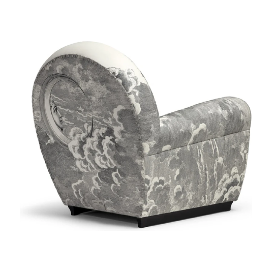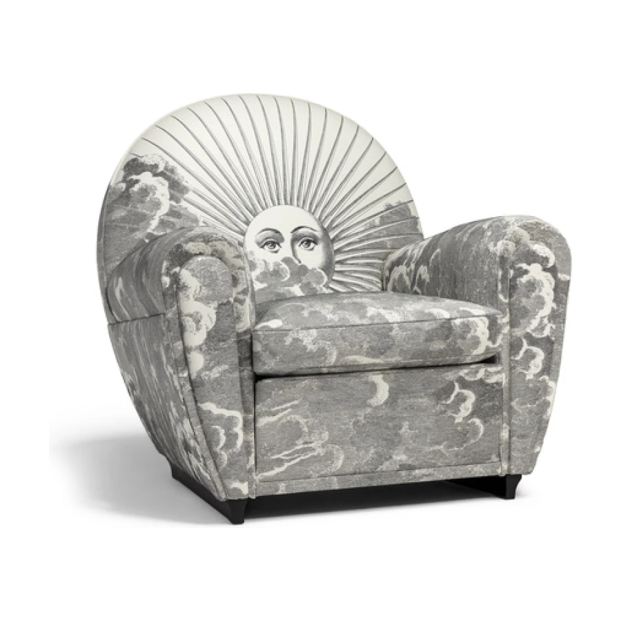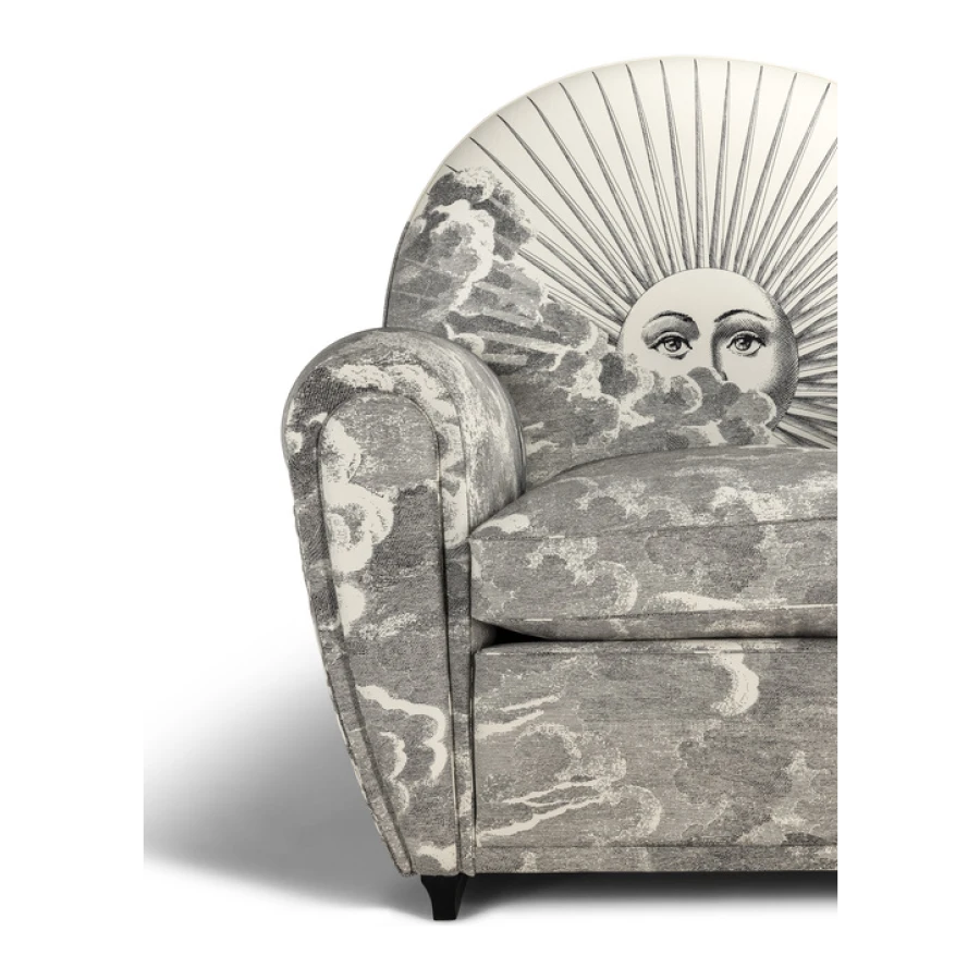 An image of the sun and of the moon rise from a whirl of clouds decorating the entire surface of the armchair. A dreamlike, mysterious and surreal image, a trademark style of Fornasetti’s, retrieved from his historical archive and specially developed for Poltrona Frau. An ode to the power and freedom of imagination.
