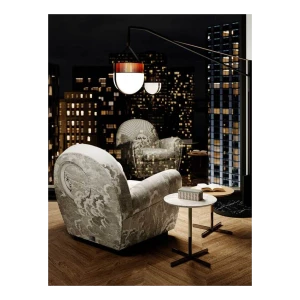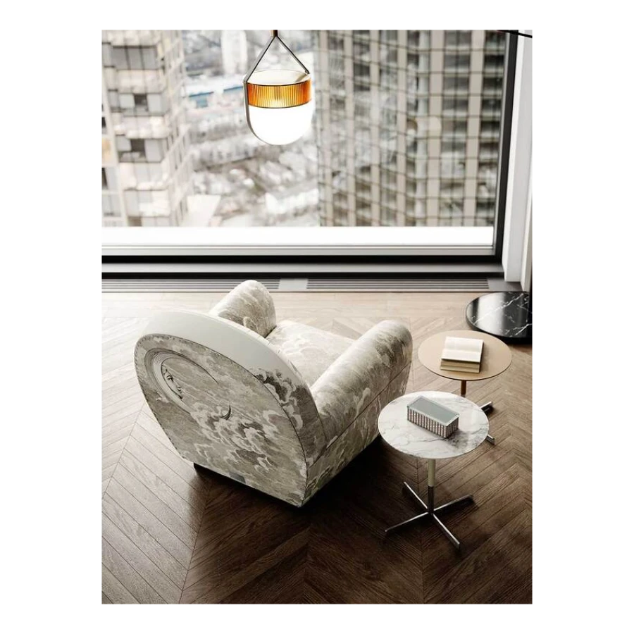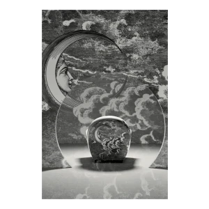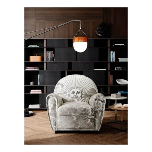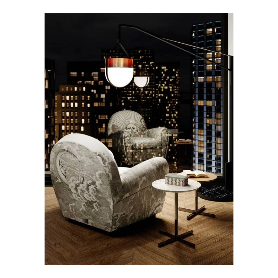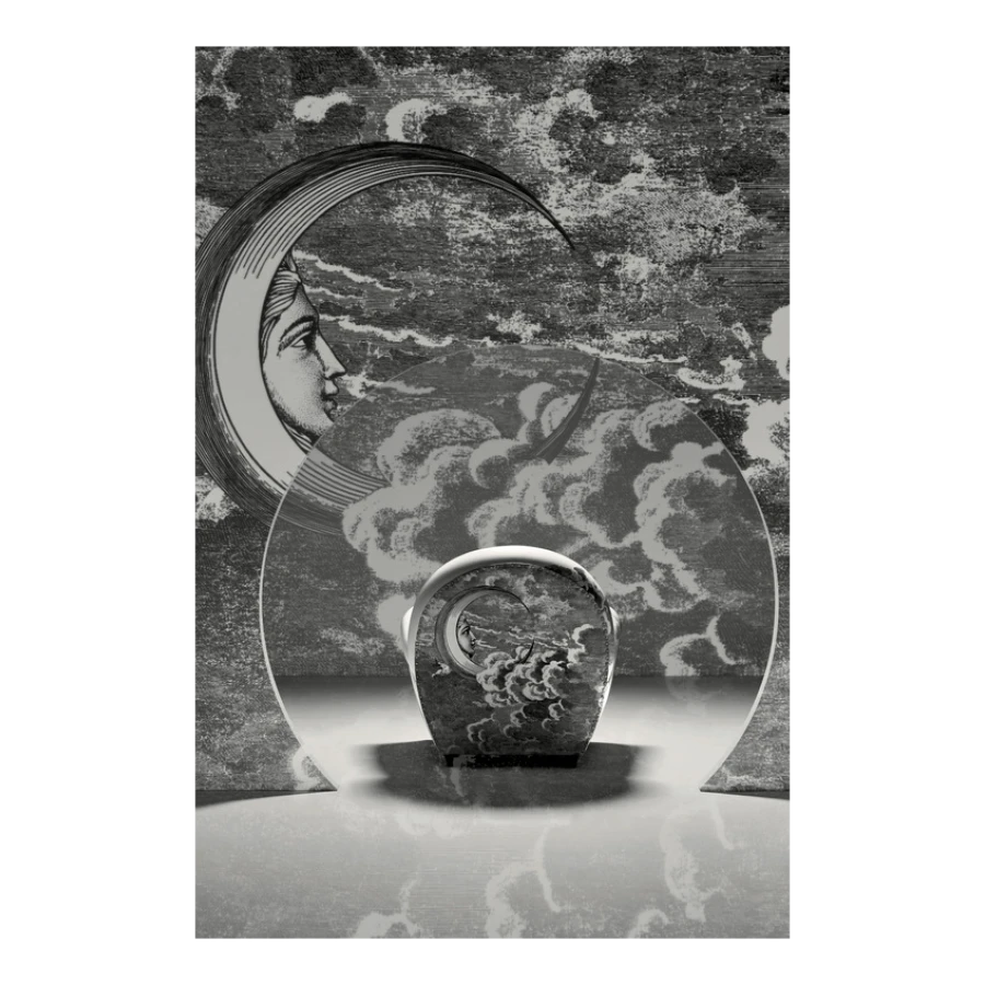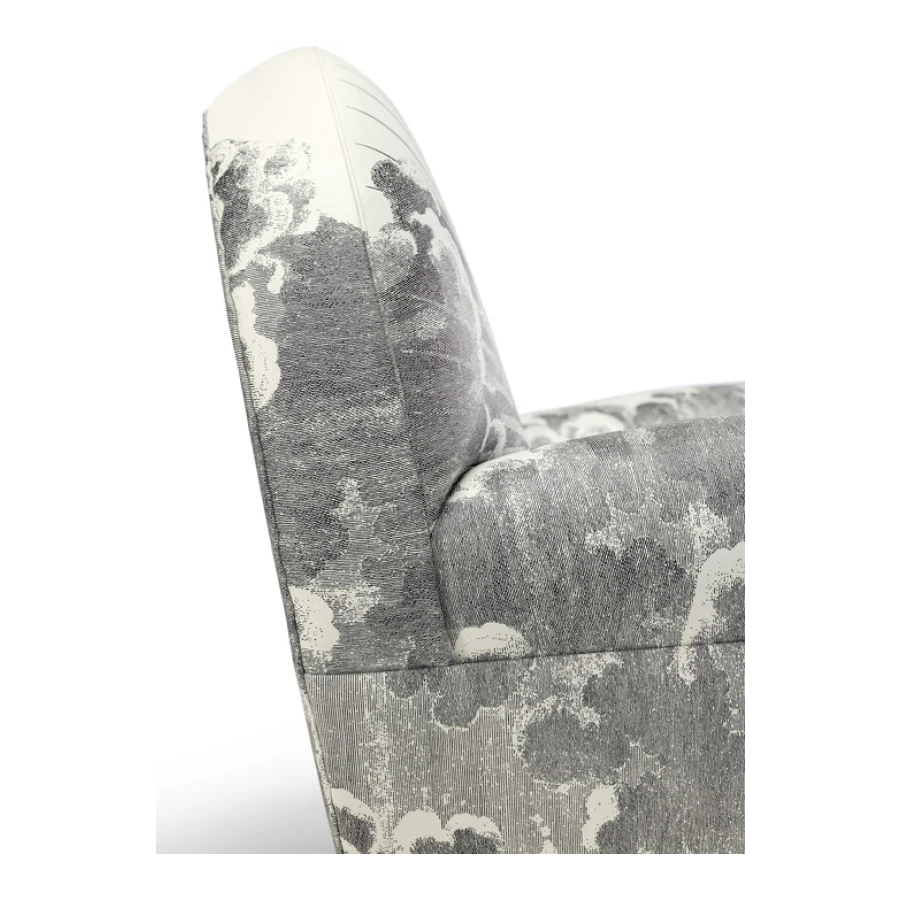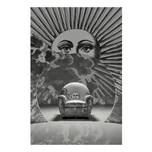 An image of the sun and of the moon rise from a whirl of clouds decorating the entire surface of the armchair. A dreamlike, mysterious and surreal image, a trademark style of Fornasetti’s, retrieved from his historical archive and specially developed for Poltrona Frau. An ode to the power and freedom of imagination.