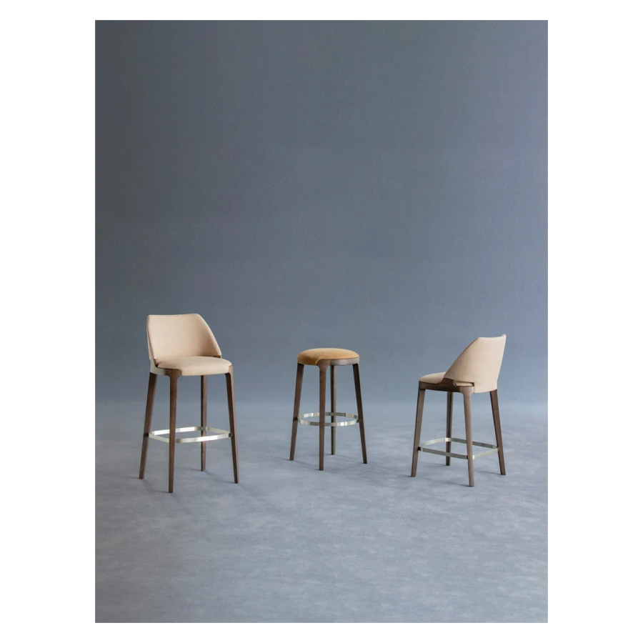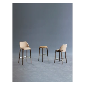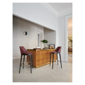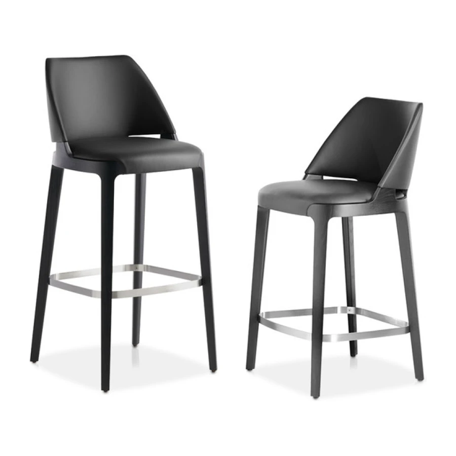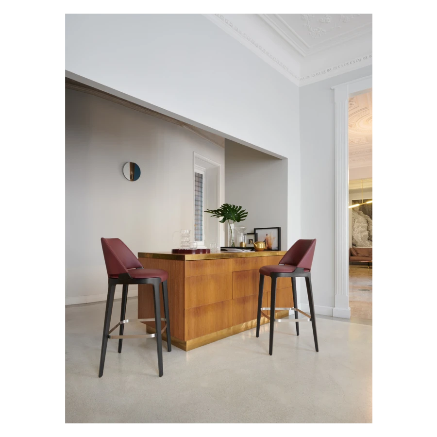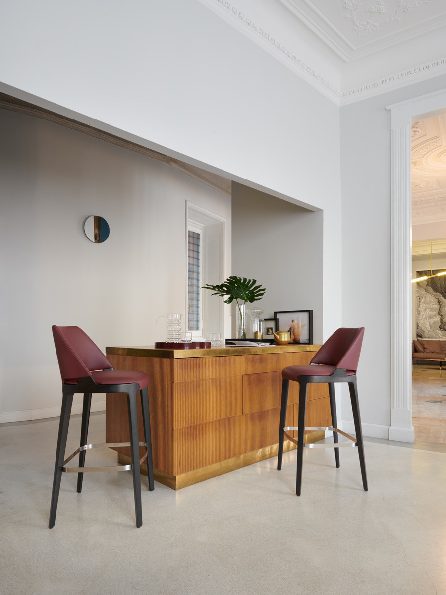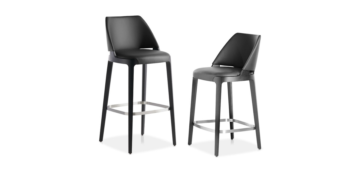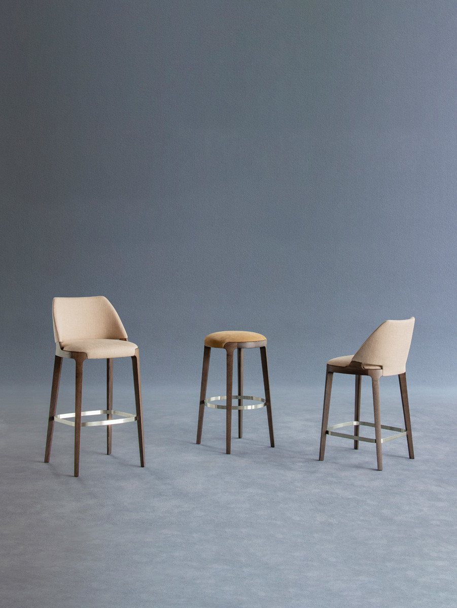 In the single stool version, is presented in two different heights, with seat and backrest padded in fire retardant polyurethane foam. Seat details in solid ash wood or Canaletto walnut.