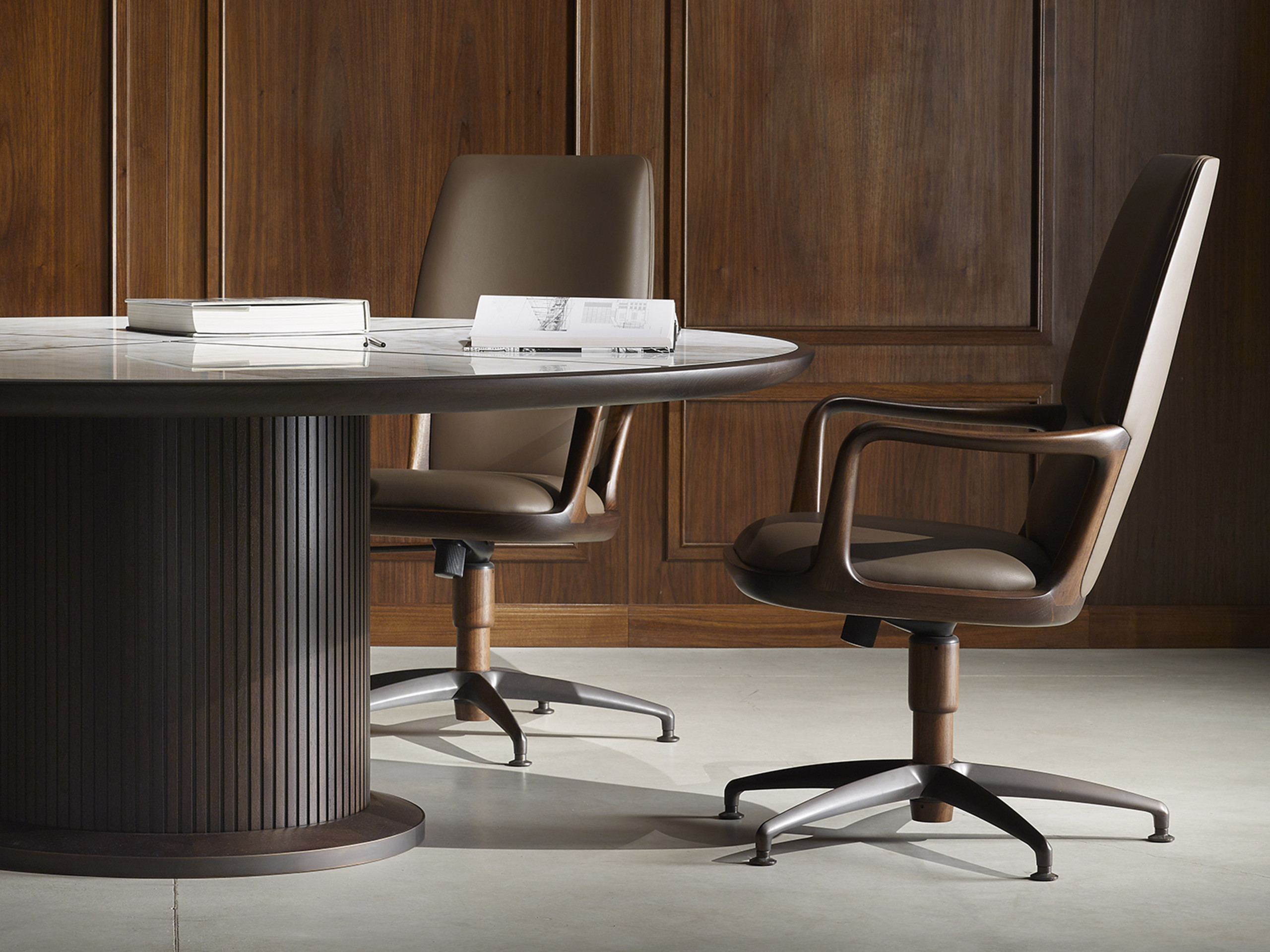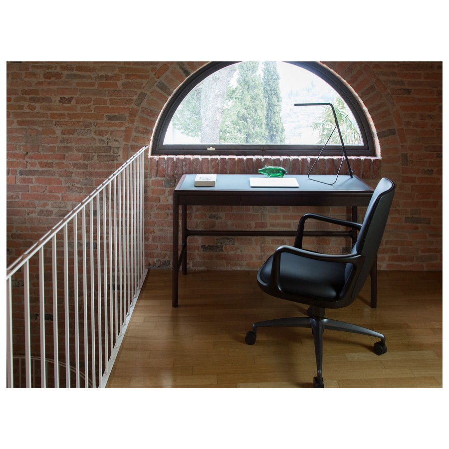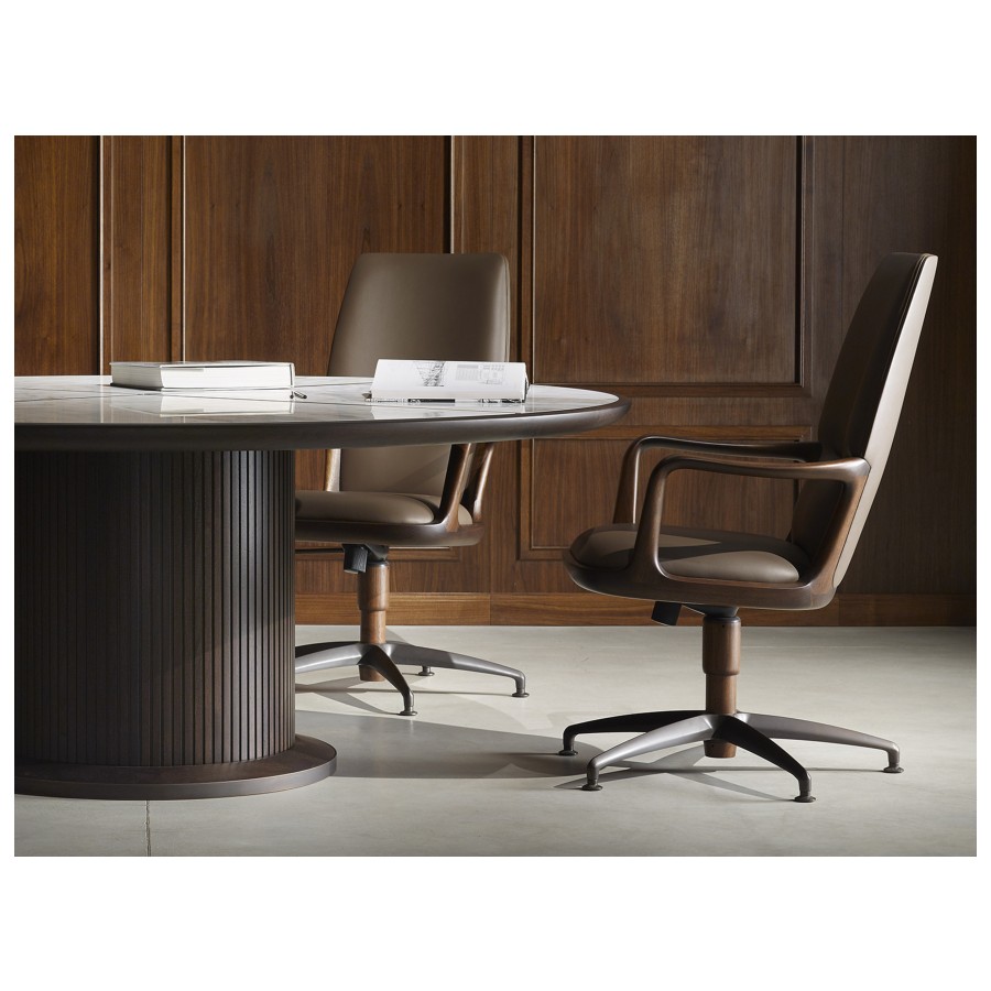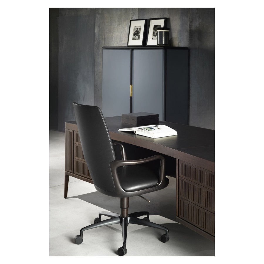 Designed by Giuseppe Casarosa in 2016. Vossia is an elegant directional chair made from FSC-certified solid American walnut wood. The curved poplar plywood backrest has polyurethane foam padding. The five-star swivel castor base is made from brushed aluminum with a bronze finish. A version with fixed brass feet is also available on request.