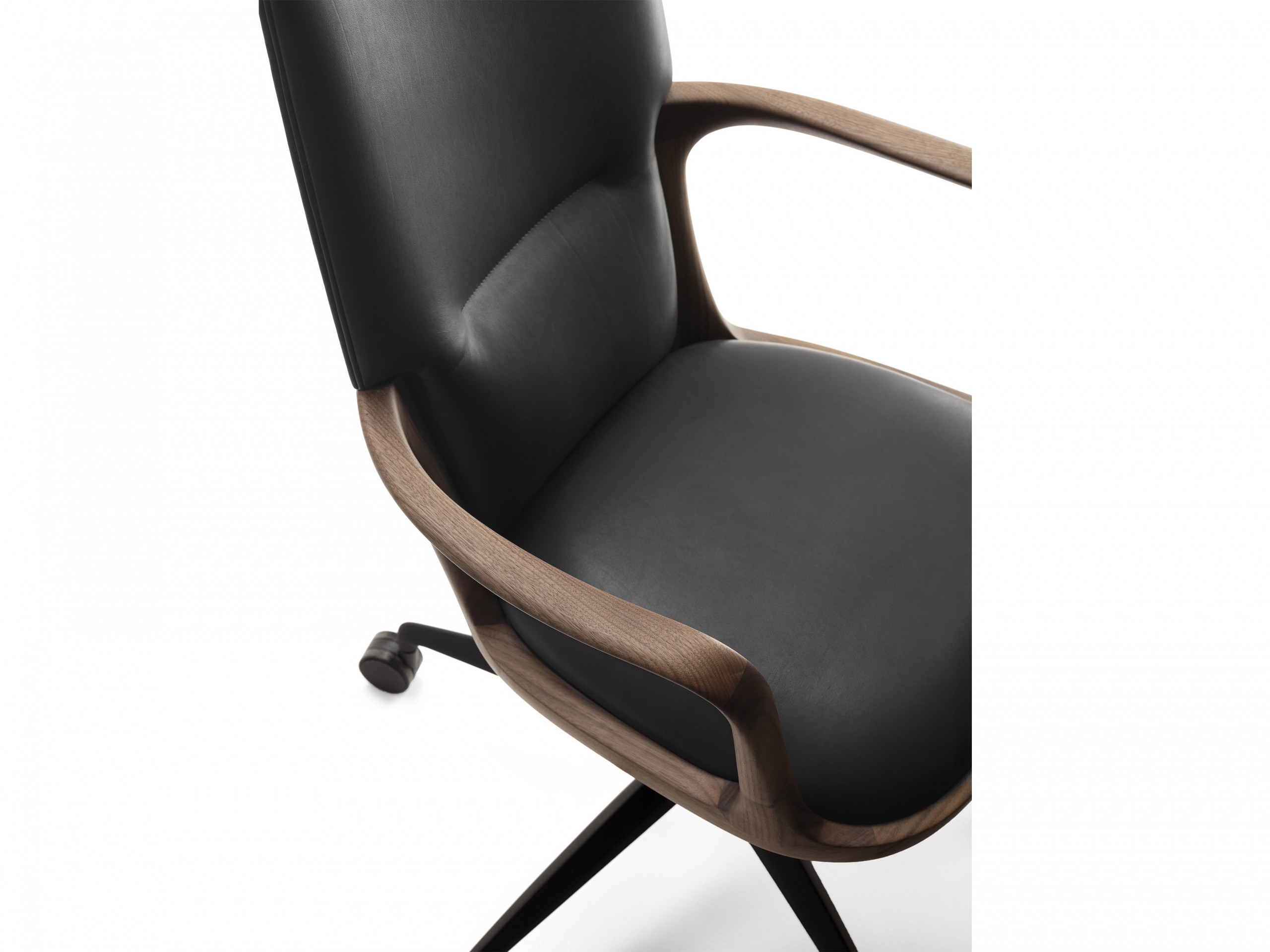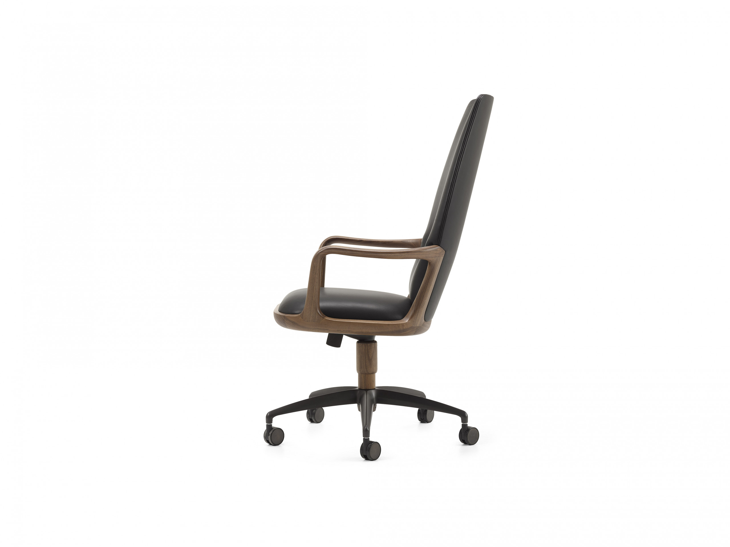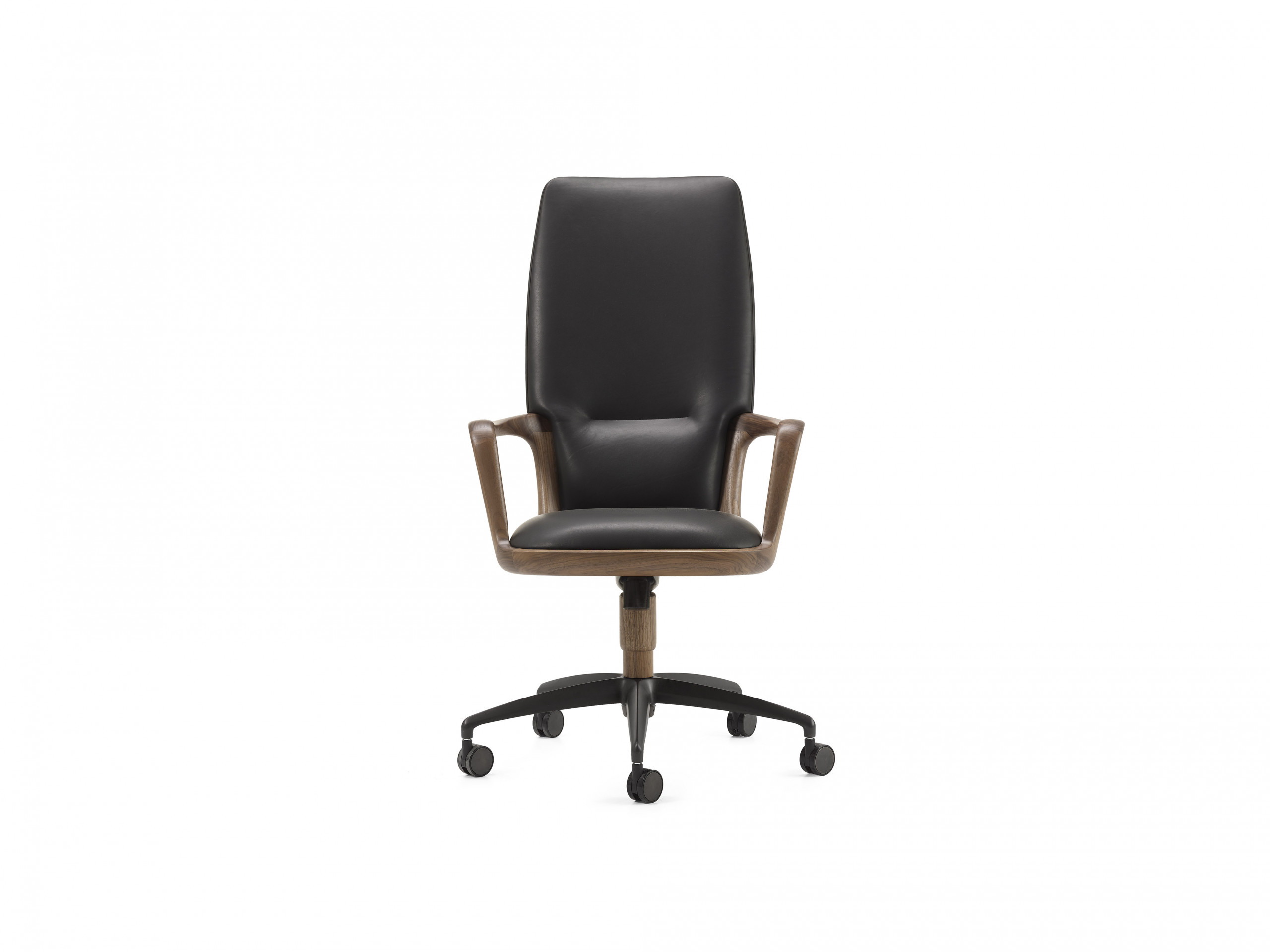 Designed by Giuseppe Casarosa in 2016. Vossia is an elegant directional chair made from FSC-certified solid American walnut wood. The curved poplar plywood backrest has polyurethane foam padding. The five-star swivel castor base is made from brushed aluminum with a bronze finish. A version with fixed brass feet is also available on request.