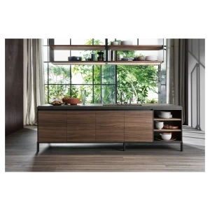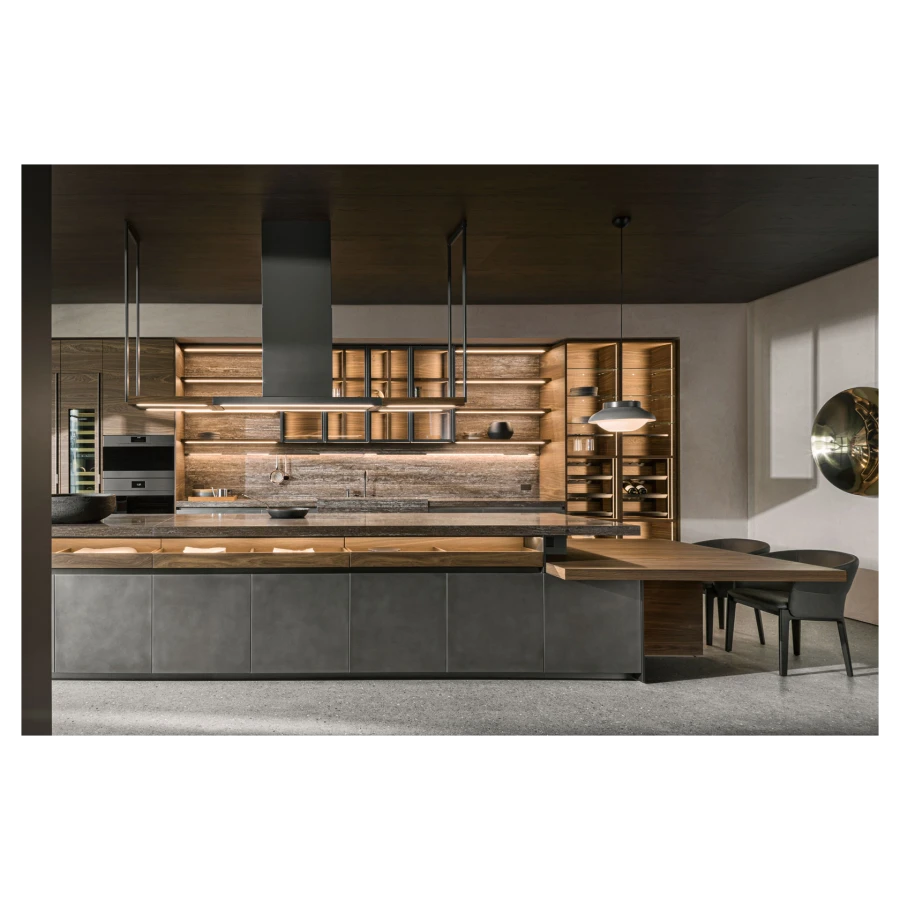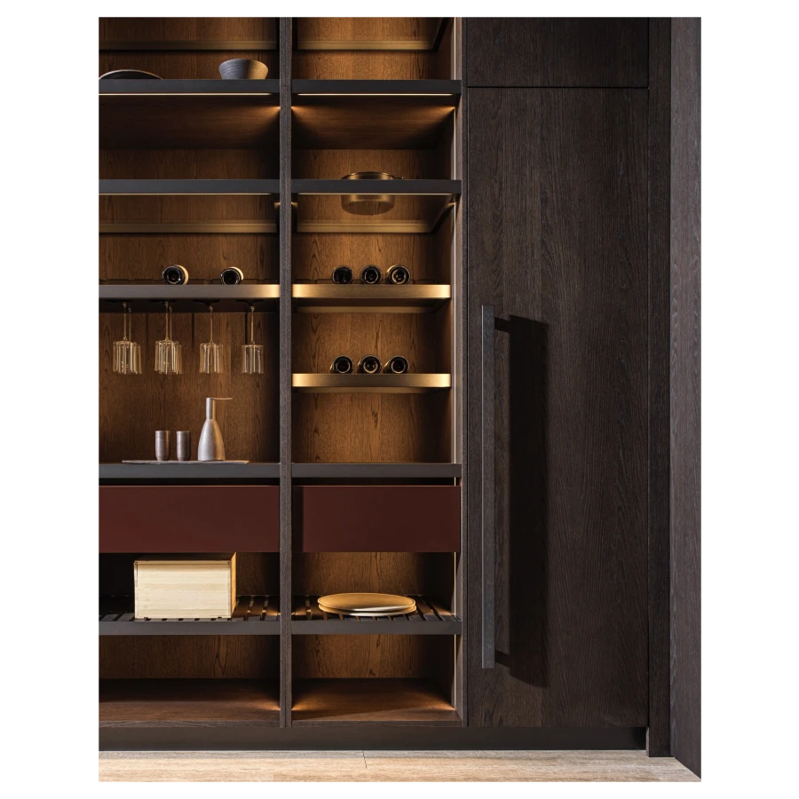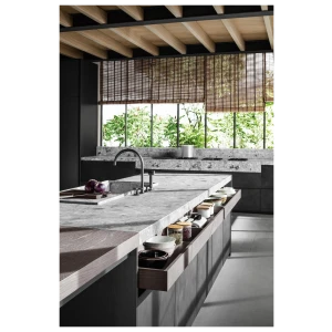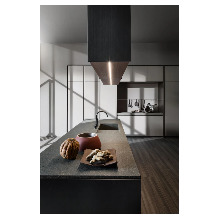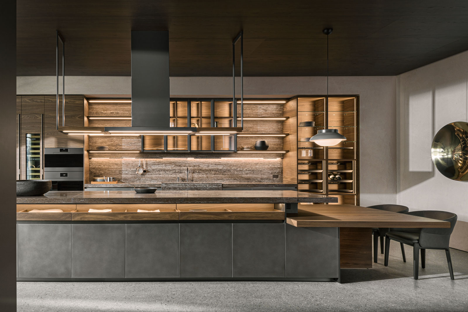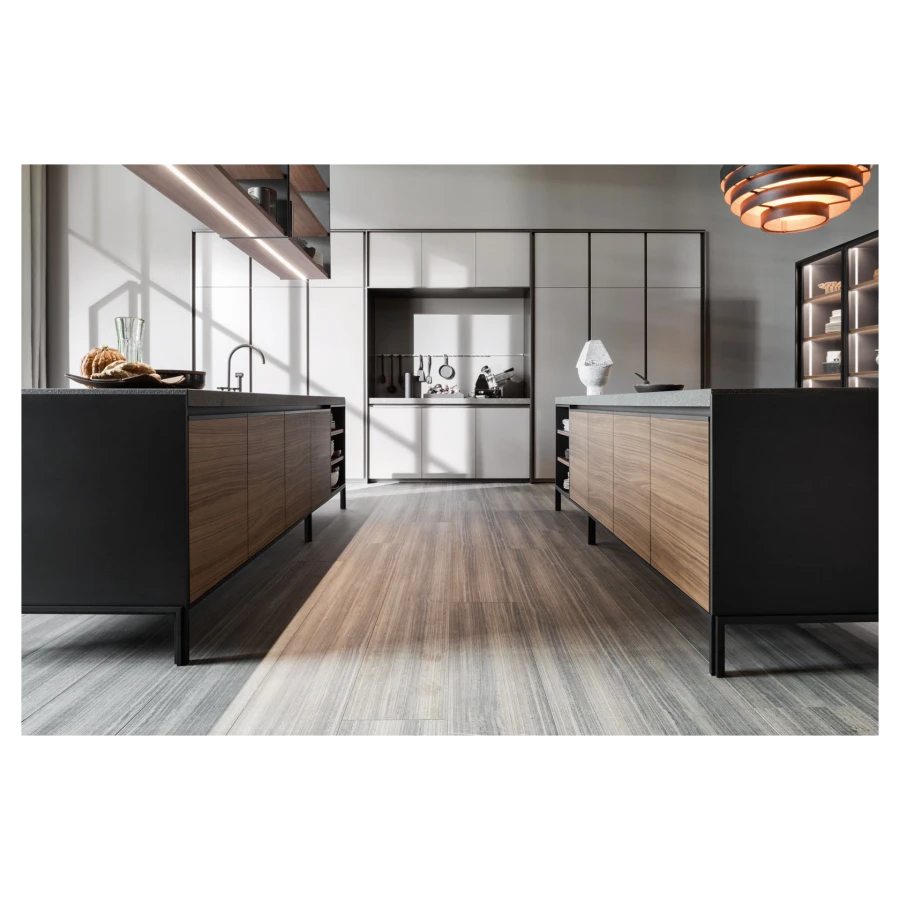 The combination of varied materials and interplay of solids and voids create a dynamic and sophisticated kitchen. Large pull-out trays, open-ended drawers, and under-top trolleys complete the project. An aluminum load-bearing structure allows for completely suspended compositions. Technological innovations such as discreet aluminum door handles for enhanced grip and the innovative Pivot hinge, enabling doors to open at 180 degrees, demonstrate true innovation.