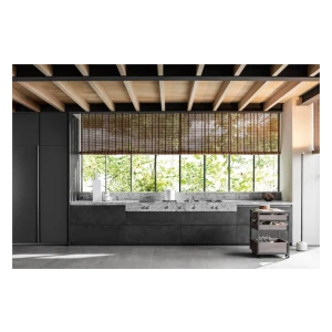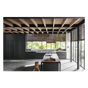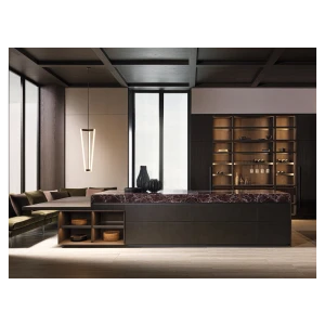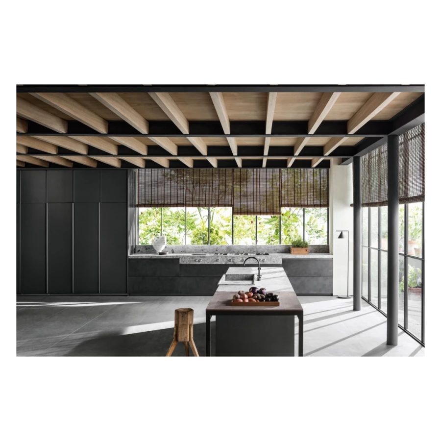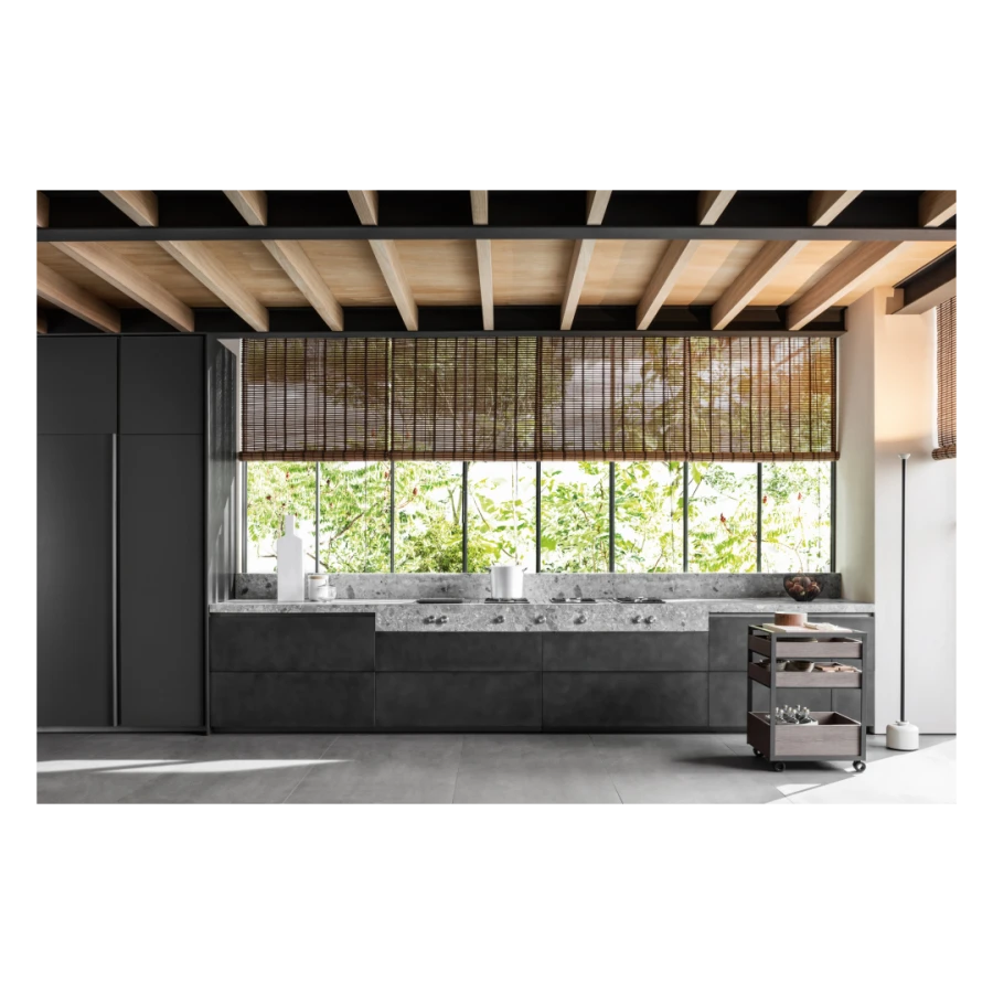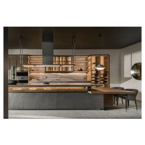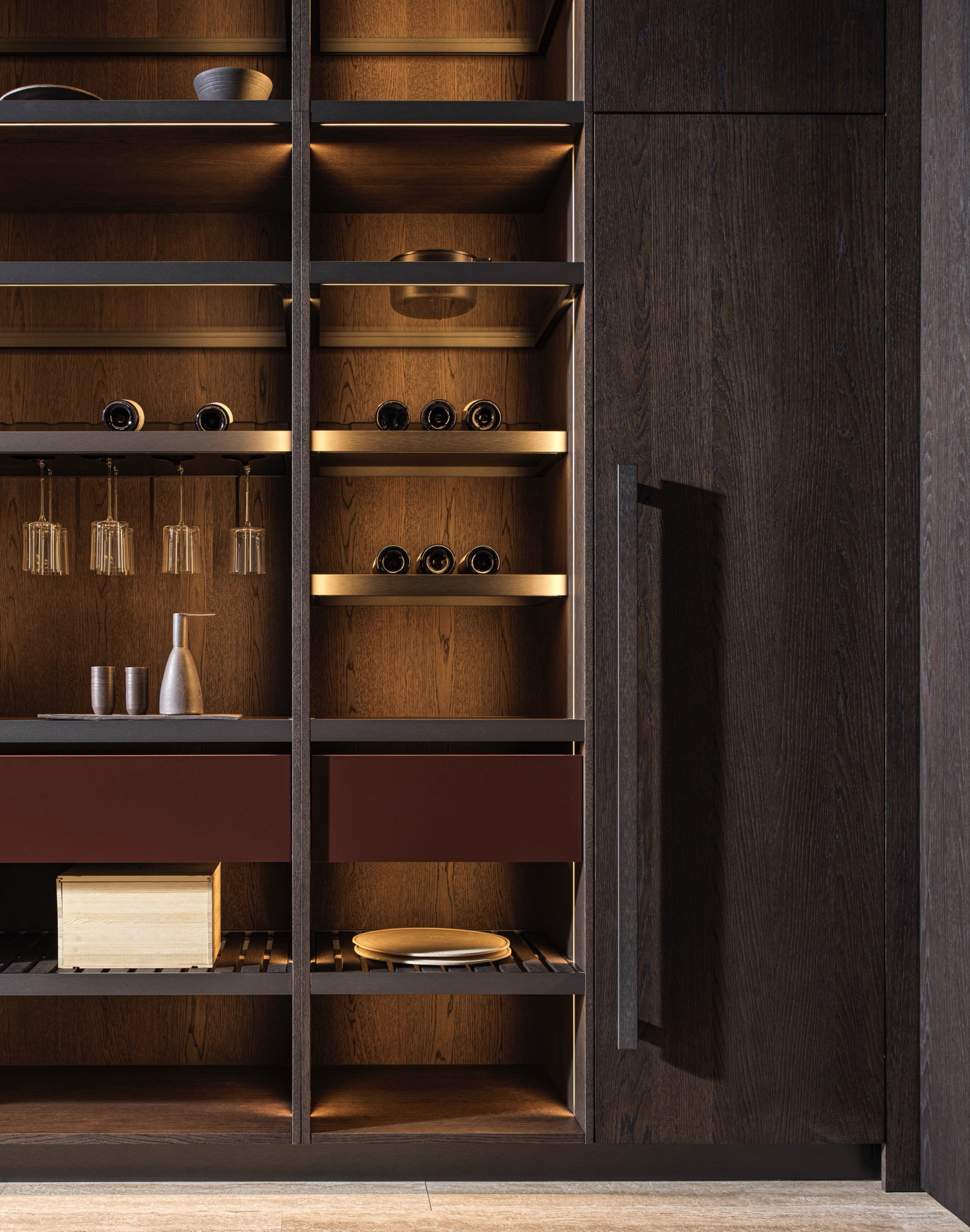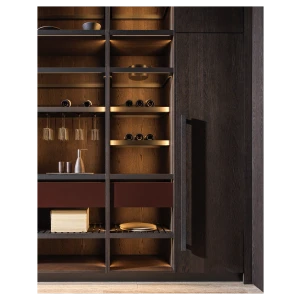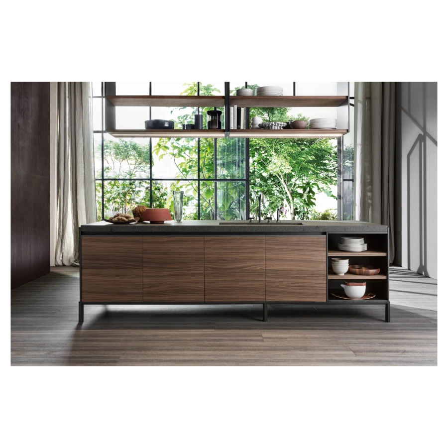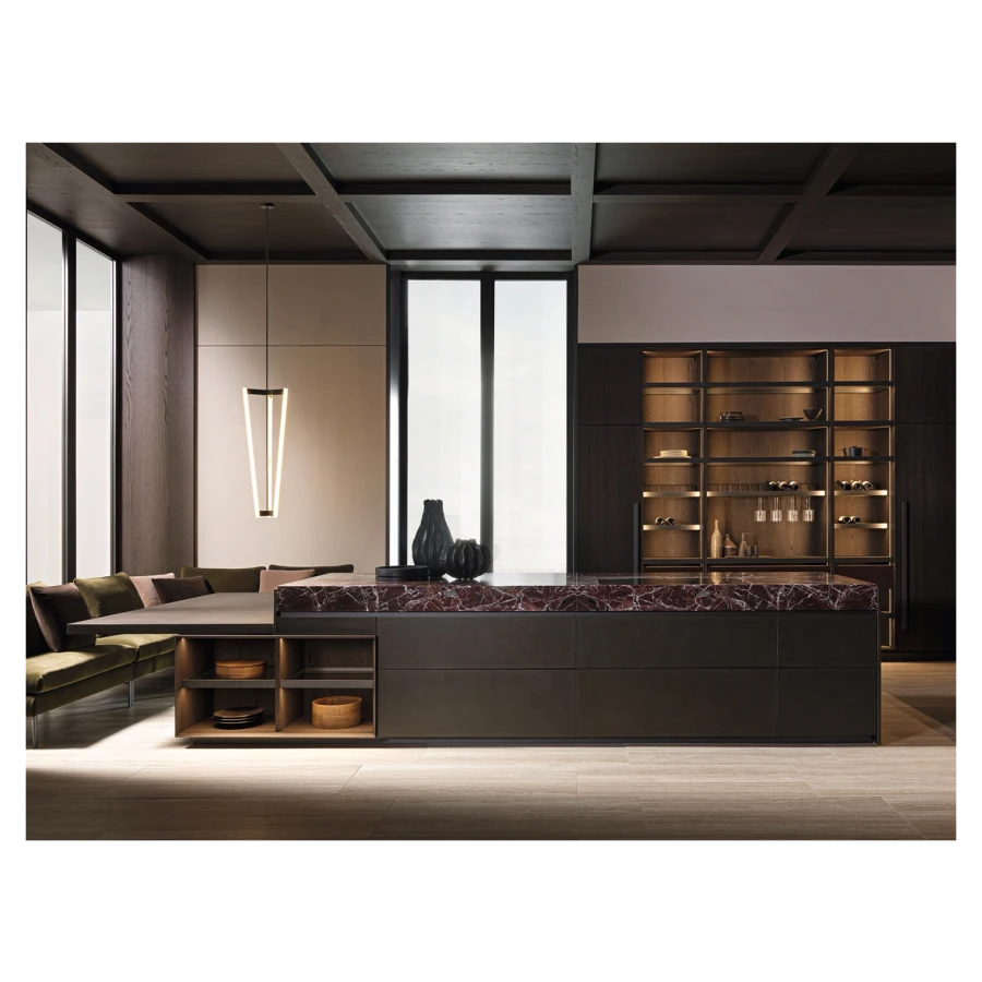 The combination of varied materials and interplay of solids and voids create a dynamic and sophisticated kitchen. Large pull-out trays, open-ended drawers, and under-top trolleys complete the project. An aluminum load-bearing structure allows for completely suspended compositions. Technological innovations such as discreet aluminum door handles for enhanced grip and the innovative Pivot hinge, enabling doors to open at 180 degrees, demonstrate true innovation.