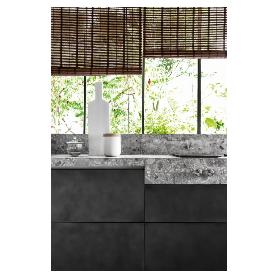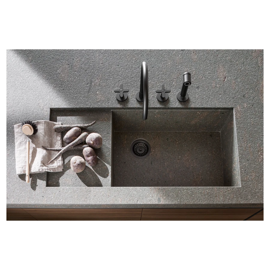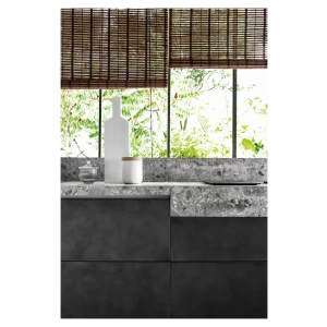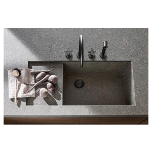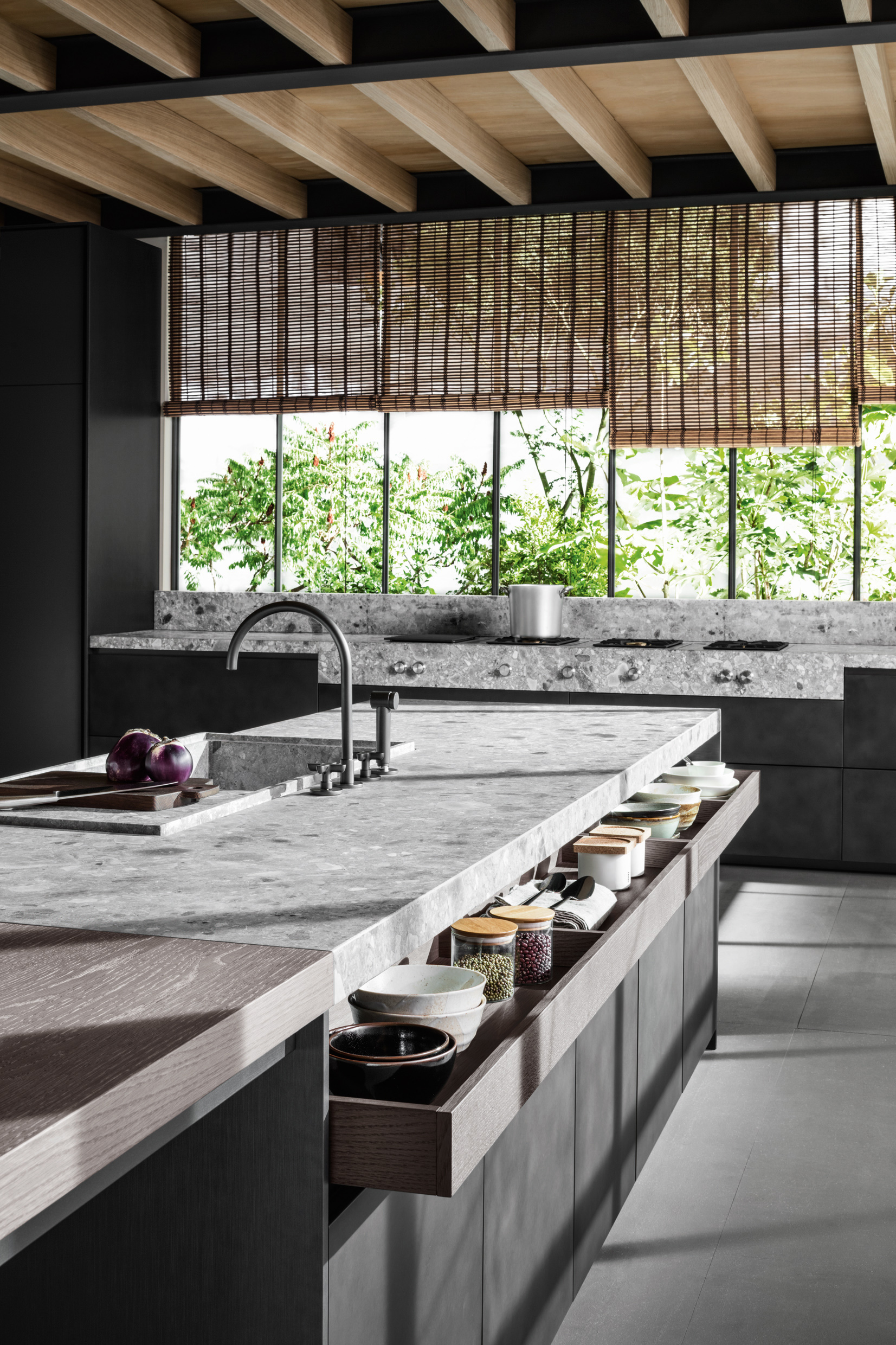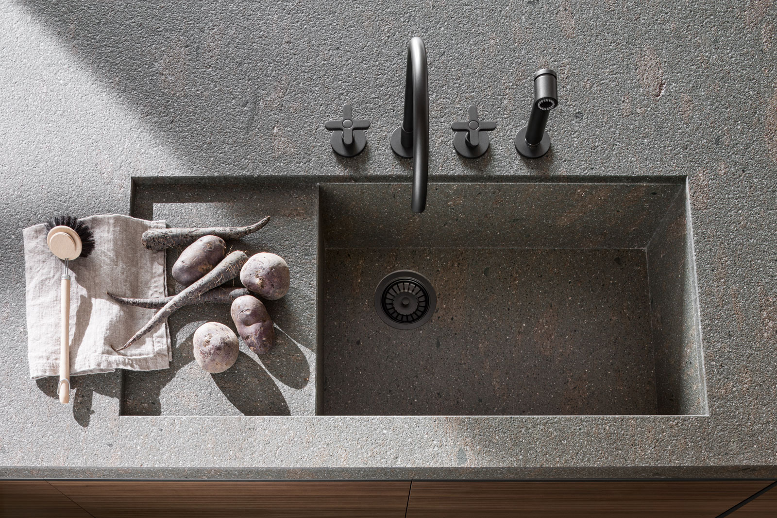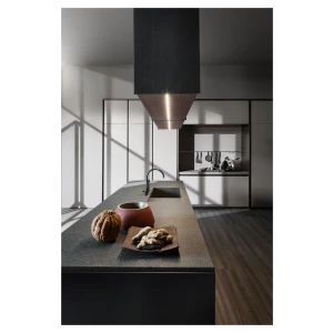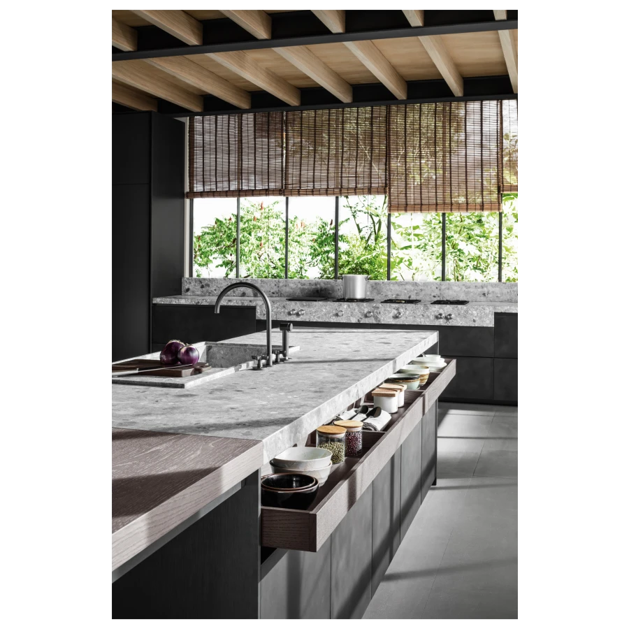 Vincent Van Duysen reimagines the finger recess detail in a modern and sophisticated manner. Slim side and end units contrast with the substantial thickness of the worktops, interrupted by sculptural stone sink bowls. Additional end panels for VVD are available in 16mm thickness, partially covering the side of the worktop and highlighting its thickness in a unique play of proportions.