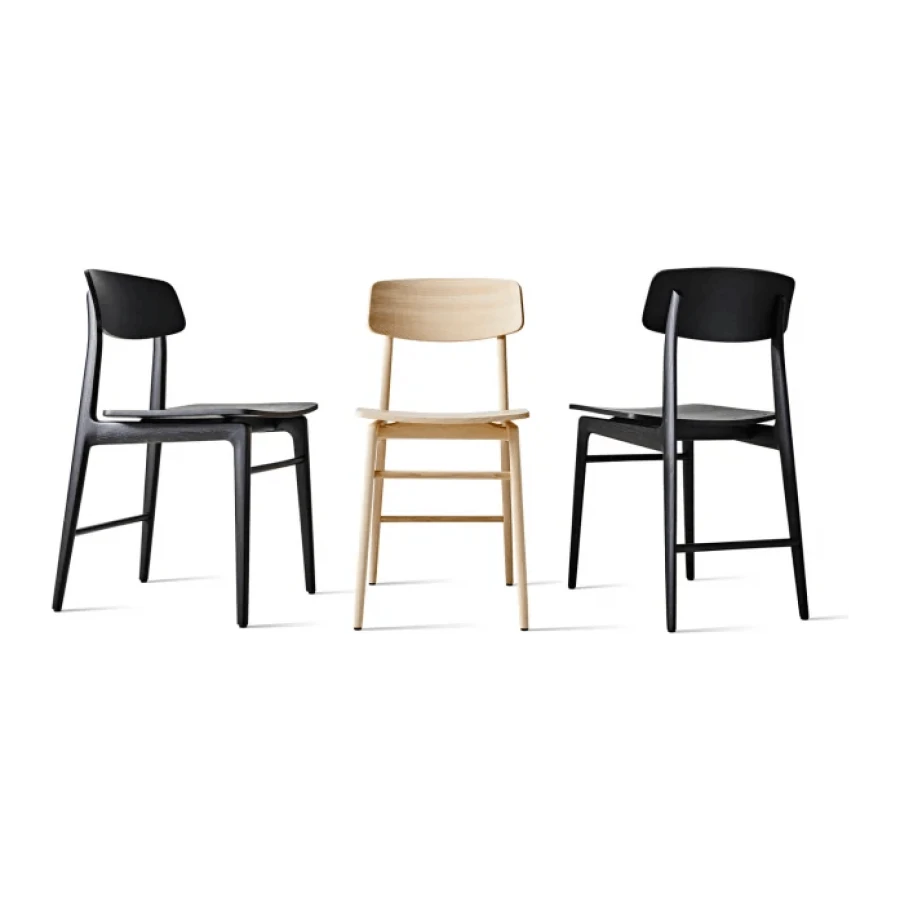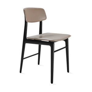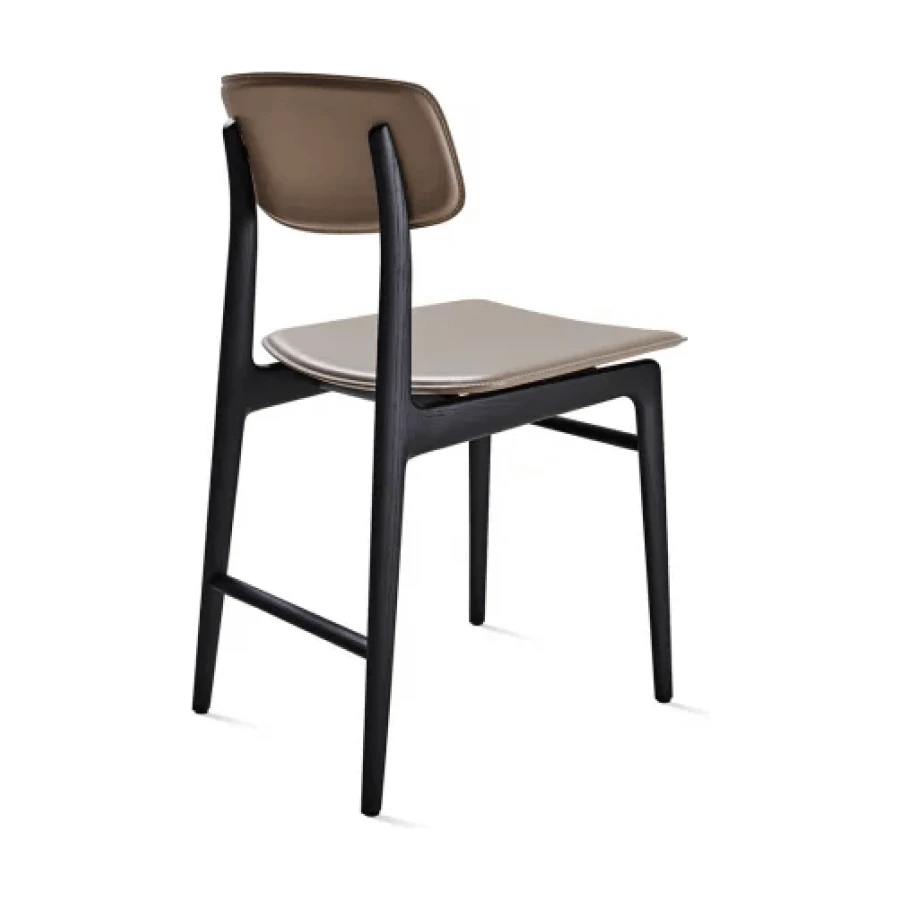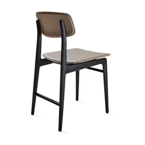 This solid wooden chair made of two finishes, Natural Ash and Black Stained Ash, features harmoniously linked lines onto which the seat and backrest, both also made of wood or covered with bonded hide leather, are placed. The totally and seamlessly jointed, screw-free construction produces a lightweight, organic effect.